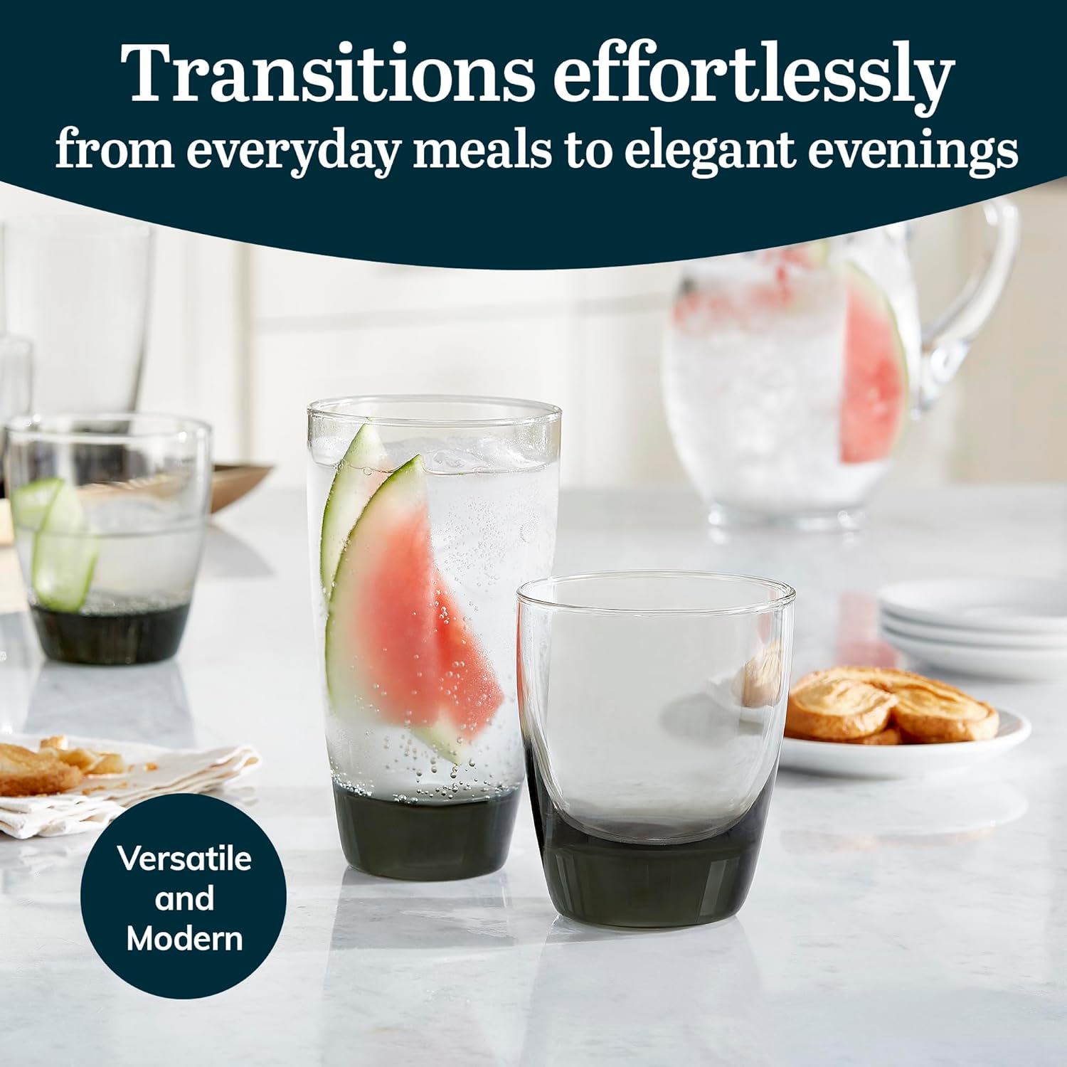 - Stable & Stylish: Crafted for durability, the smoke-hued drinking glass set features a sturdy 1-inch-thick base for a unique rounded design; the everyday water glasses has a space-saving design that fits neatly in cupboards or open shelving