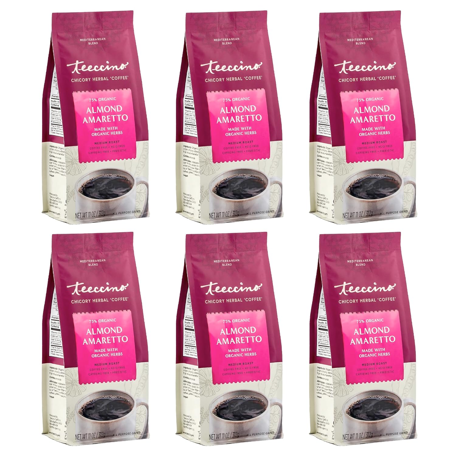 Teeccino Almond Amaretto Chicory Coffee Alternative - Ground Herbal Coffee That’s Prebiotic, Caffeine Free & Acid Free, Medium Roast, 11 Ounce (Pack of 6)