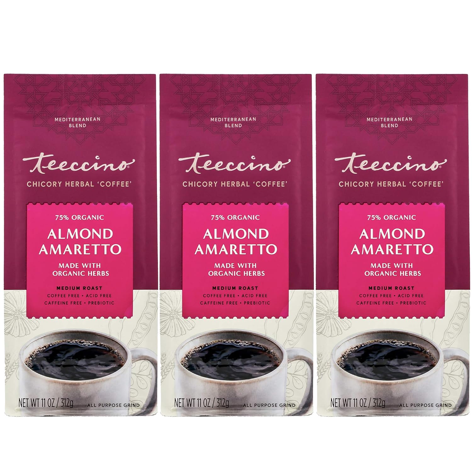 Teeccino Almond Amaretto Chicory Coffee Alternative - Ground Herbal Coffee That’s Prebiotic, Caffeine Free & Acid Free, Medium Roast, 11 Ounce (Pack of 3)