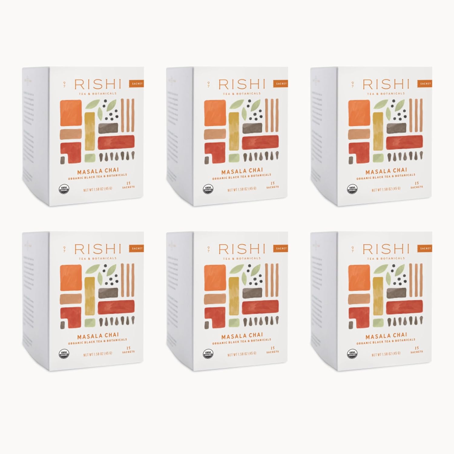 Rishi Tea Masala Chai Tea - Organic Sachet Tea Bags, Assam Black Tea Blend with Whole Spices, Energizing & Caffeinated - 15 Count (Pack of 6)
