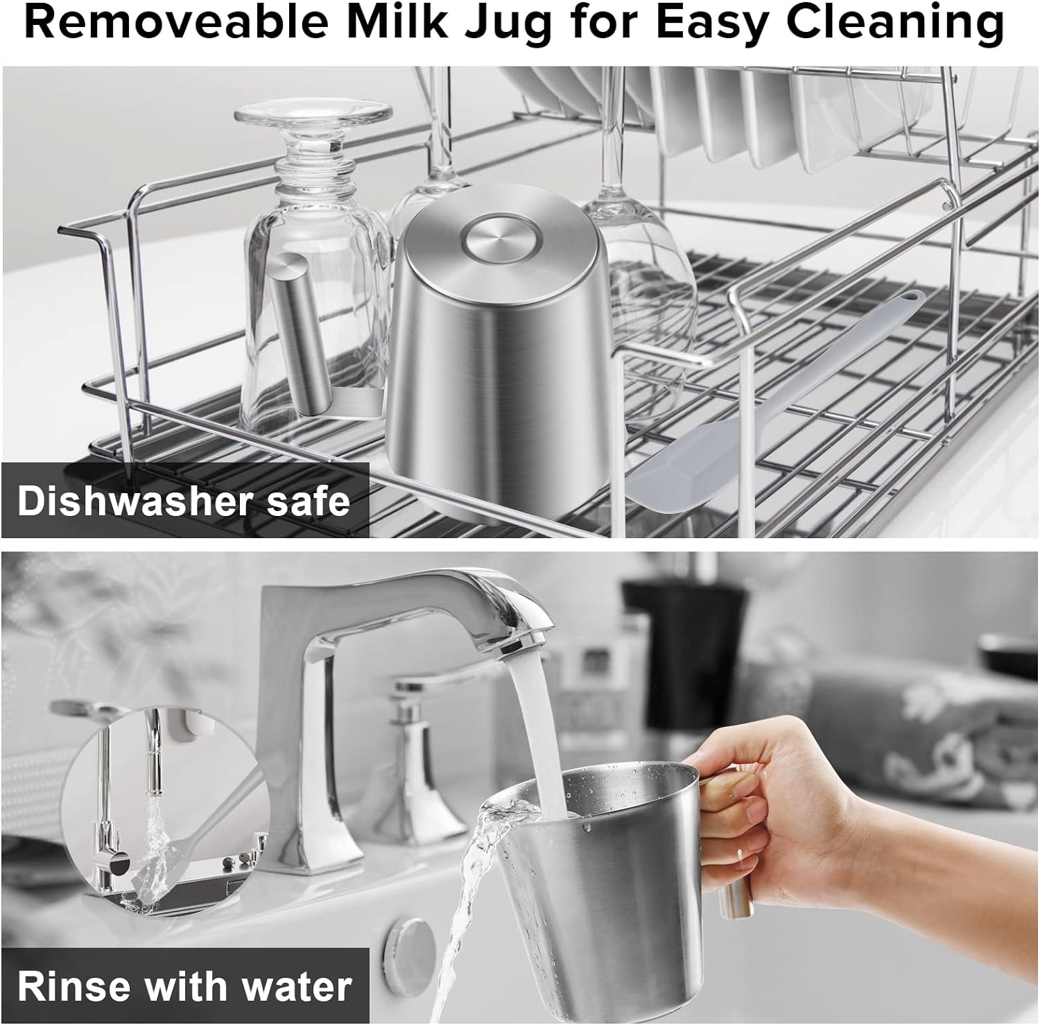 - Easy to Clean: The removable milk jug and lid make cleaning effortless. Milk foam can be collected with the included silicone spatula. All parts are BPA-free and dishwasher-safe for convenience