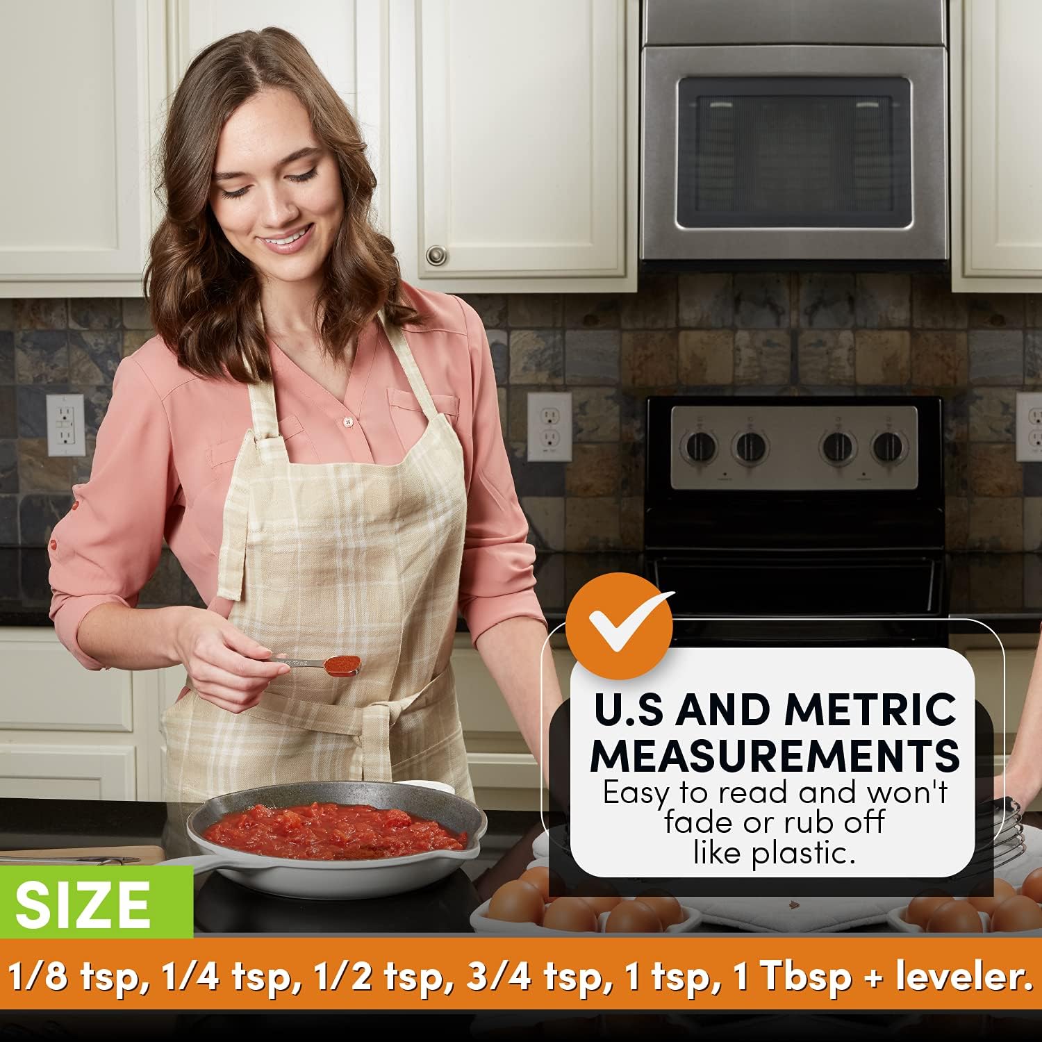 - 6 Convenient Sizes: 1/8 tsp, 1/4 tsp, 1/2 tsp, 3/4 tsp, 1 tsp, 1 Tbsp Plus a Leveler. The wide, long handle is comfortable to hold and its ergonomic design is easy to fill and level.