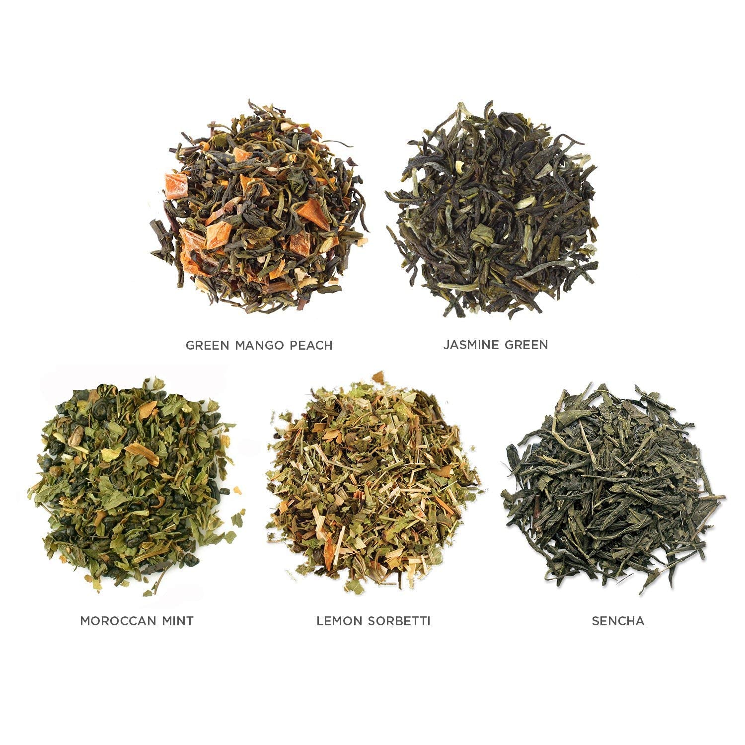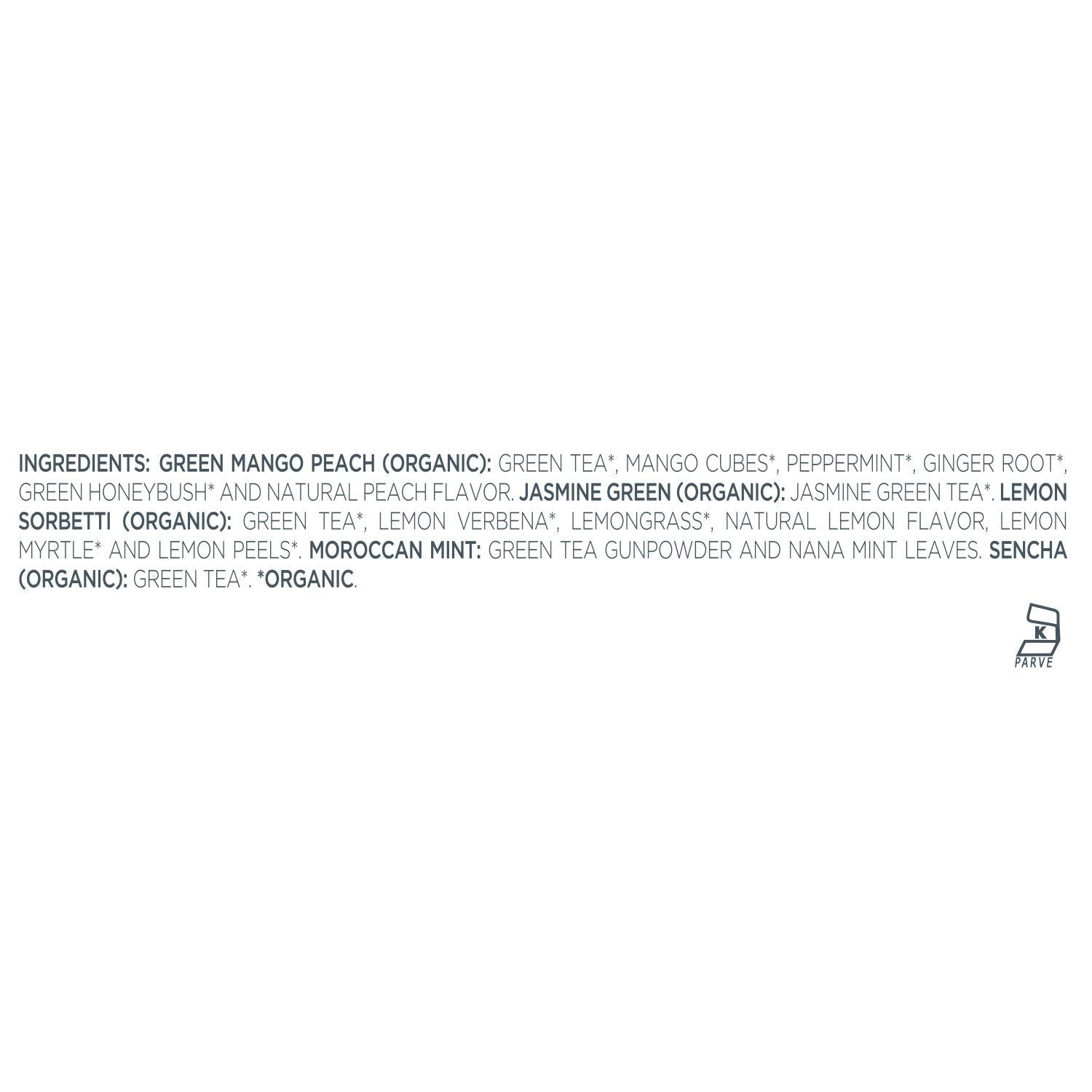 - ORGANIC GREEN TEA SAMPLER with five varieties of the world's finest green tea blends - Green Mango Peach, Jasmine Green, Moroccan Mint, Lemon Sorbetti, Sencha.