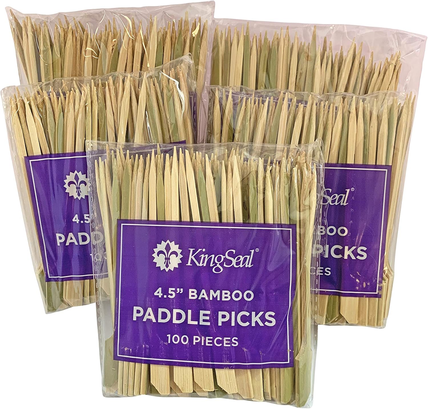 500 Count | KingSeal Natural Green Bamboo Wood Paddle Picks, Skewers for Appetizers and Cocktails, 4.5 Inches - 5 Packs of 100