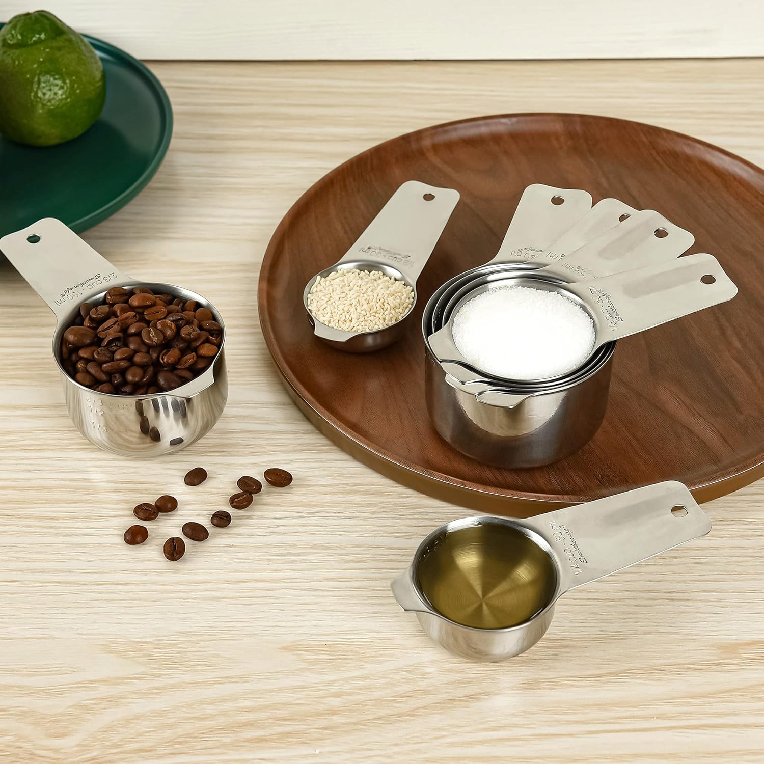 - THE BEST-NESTED MEASURING CUPS SET OF 7 PCS: 1/8cup (Coffee Scoop Size) 1/4cup, 1/3cup, 1/2cup, 2/3cup, 3/4cup, <br>1 Cup. Easy to read engraved sizes showing both 'cups' and 'mls' makes baking a breeze.