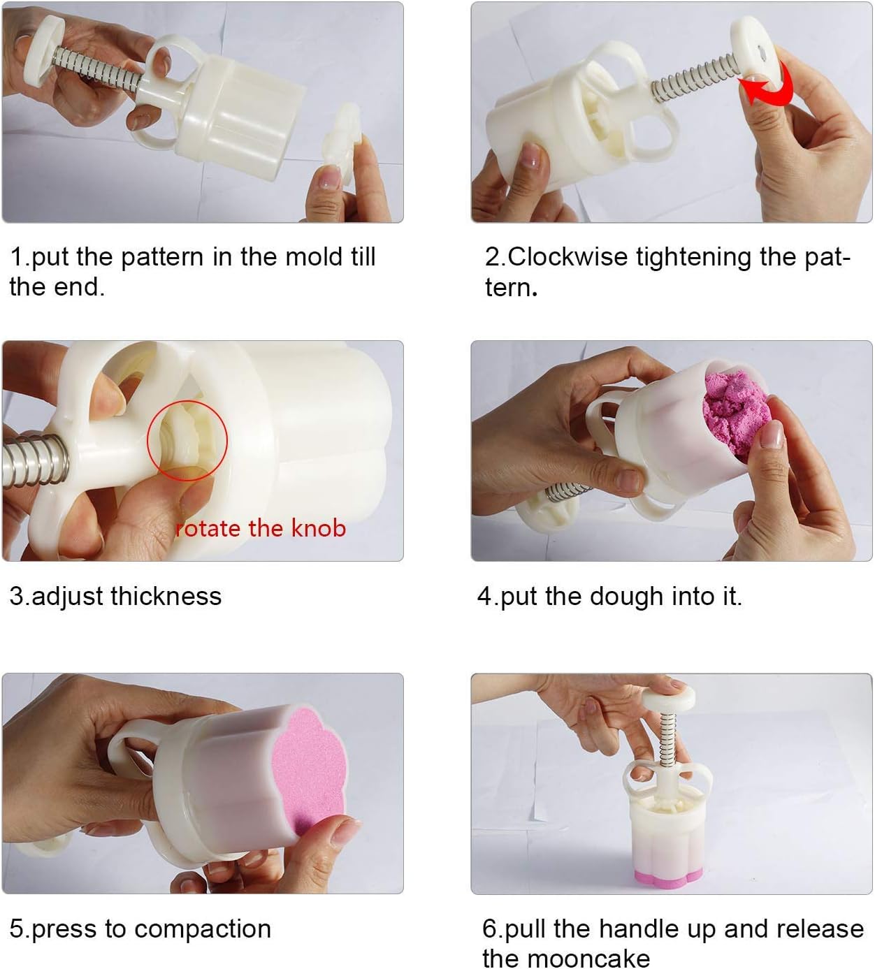 - Ddjuatble Thickness Mold Set: Comes with 6 stamps (1.8 inch diameter) 50 g mooncake mold with various of pattern, you can adjust the height of mold by turn the knob on the handle to make different sizes of cookies, shortbread cookies or mooncakes