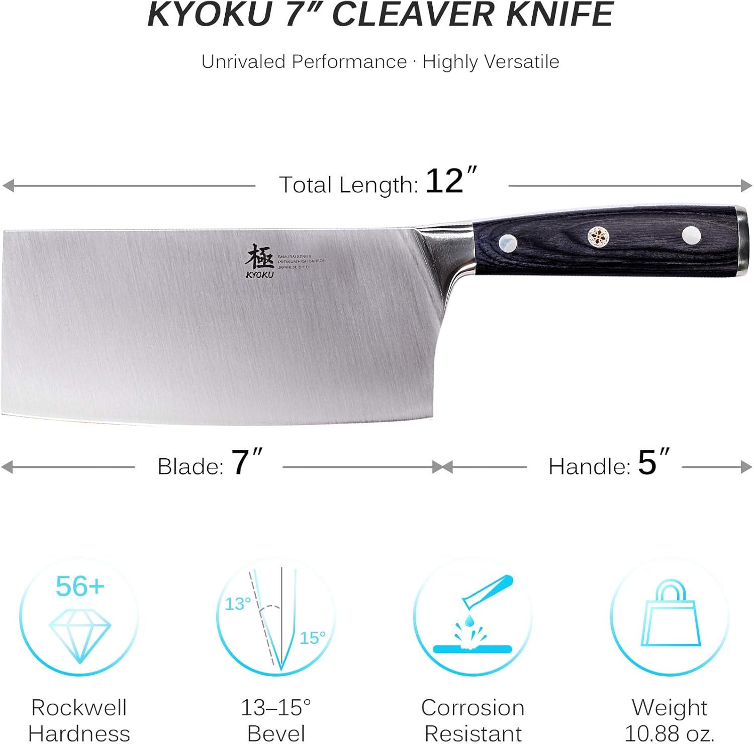KYOKU Samurai Series - 7" Cleaver Knife - Full Tang - Japanese High Carbon Steel Kitchen Knives - Pakkawood Handle with Mosaic Pin - with Sheath & Case