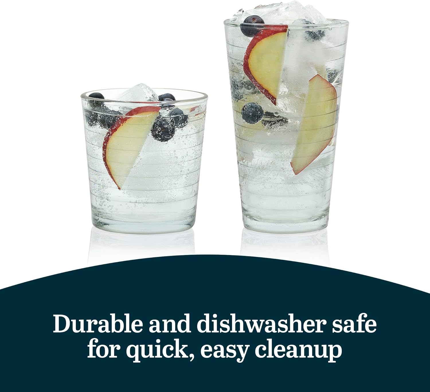 Libbey Hoops Tumbler and Rock Glass Set, Two Sized Nostalgic Retro Glass Cups Set, Dishwasher Safe Glasses Drinking Set of 16 for Any Occasion