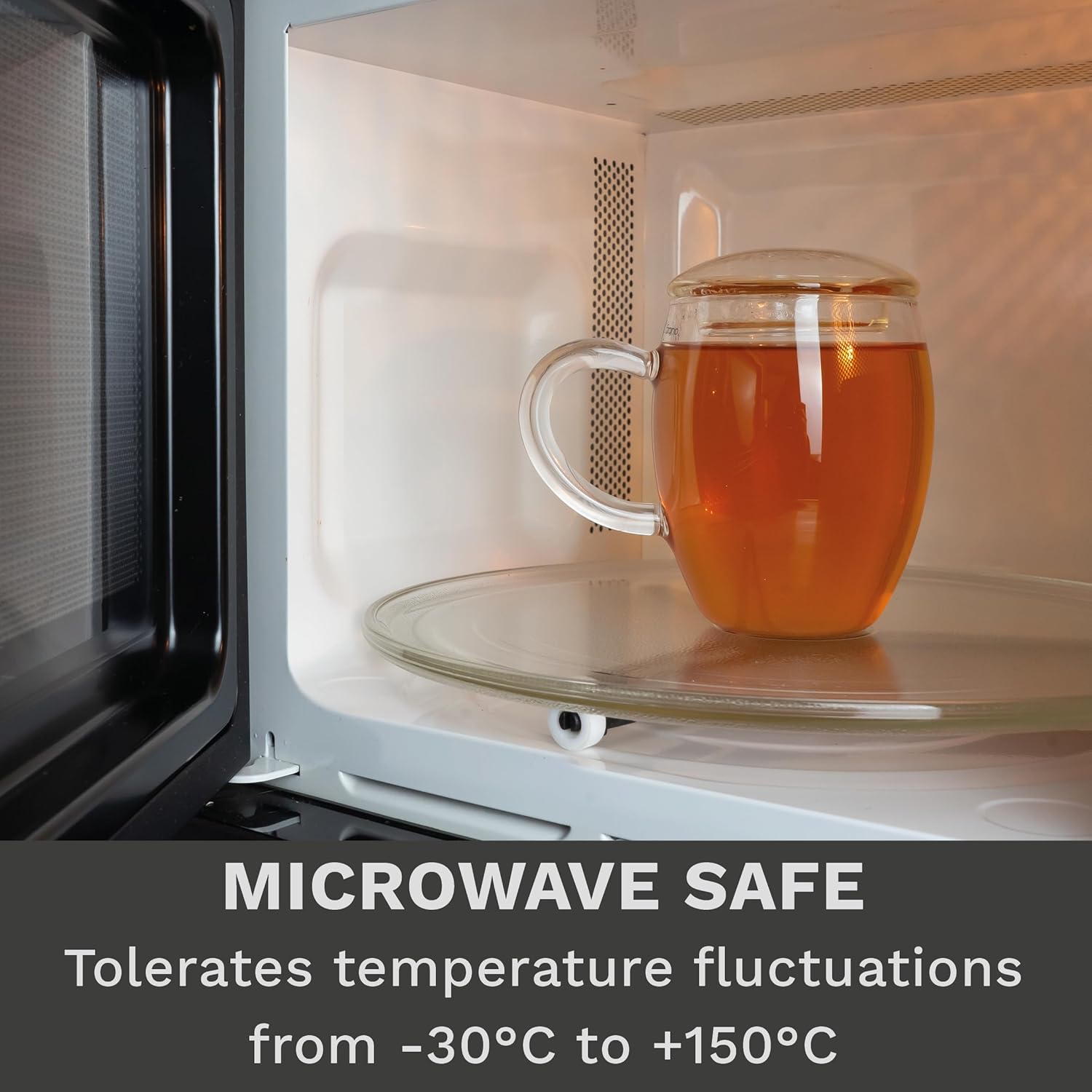 - SPECIAL FEATURES: The stainless steel filter has extremely fine pores, so that all particles are retained and do not get into the glass. As soon as the tea has finished brewing, the filter can be placed directly in the lid.