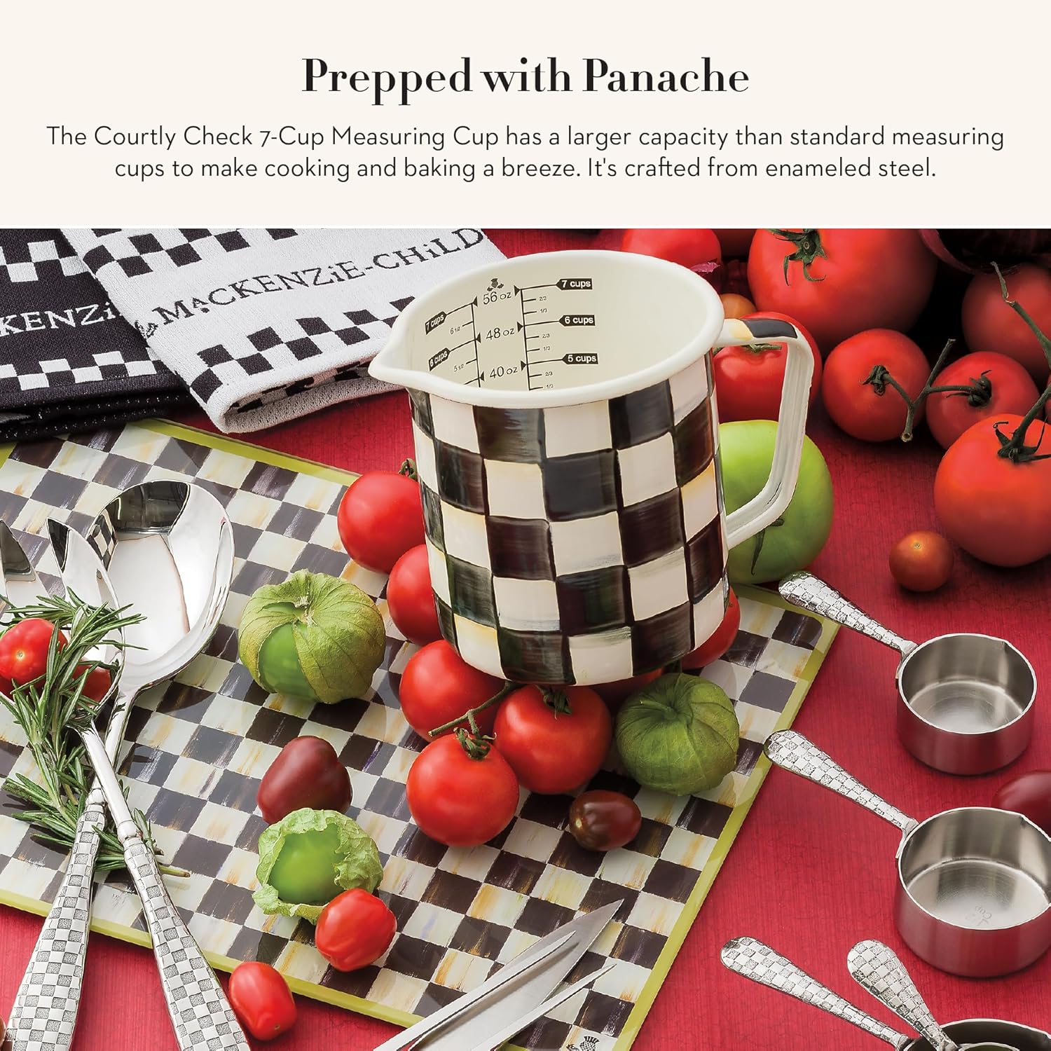 MACKENZIE-CHILDS Enamel 7-Cup Measuring Cup, Decorative Measuring Cup with Spout, Black-and-White Courtly Check