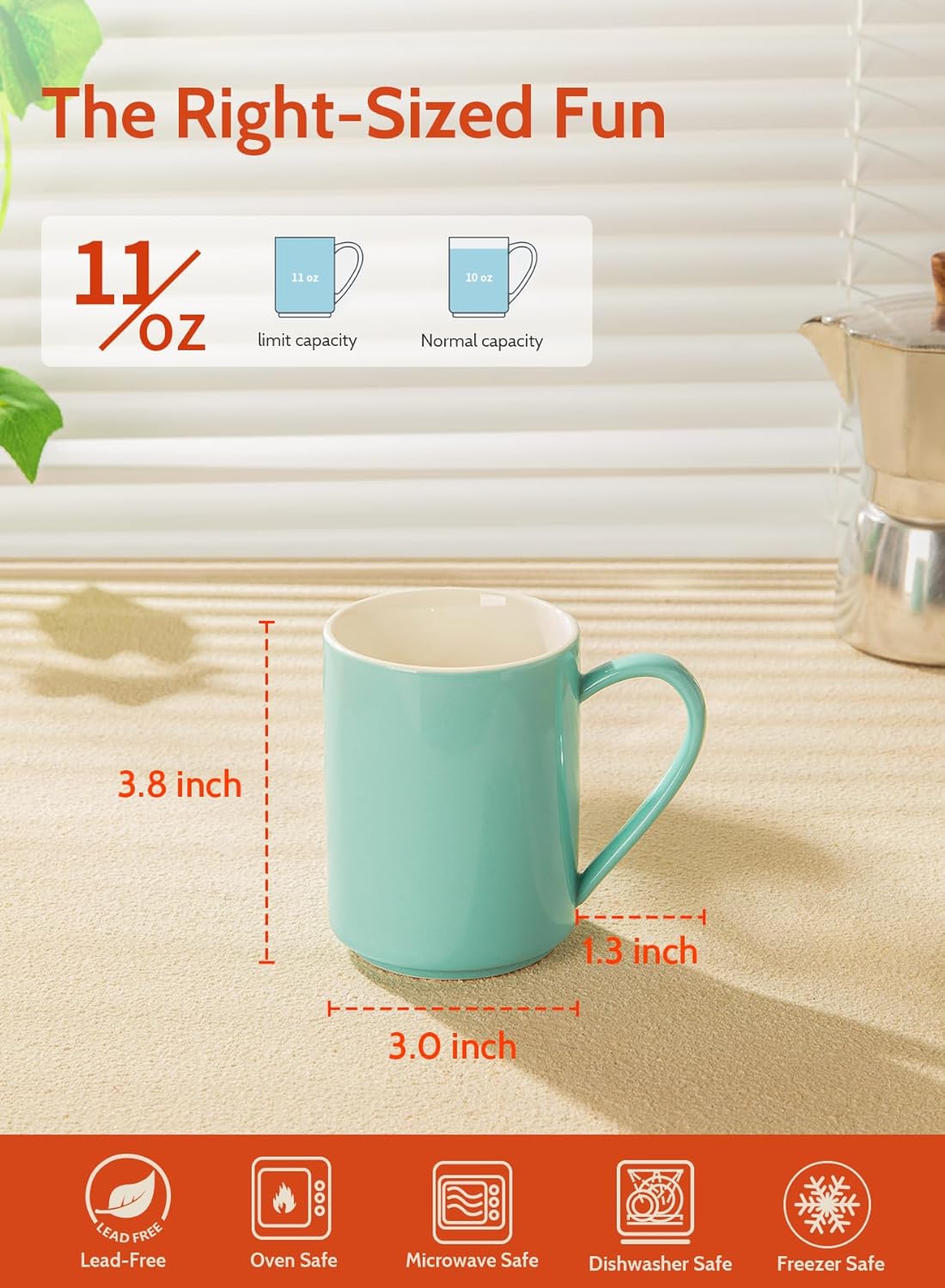 - JUST THE RIGHT SIZE: Nice feel to these ceramic coffee mugs set of 6, both in weight and materials. Perfect size, shape, and big handle, it's also great for brewing from the coffee machine. The colors are beautiful, and bright, with a bit of gloss.