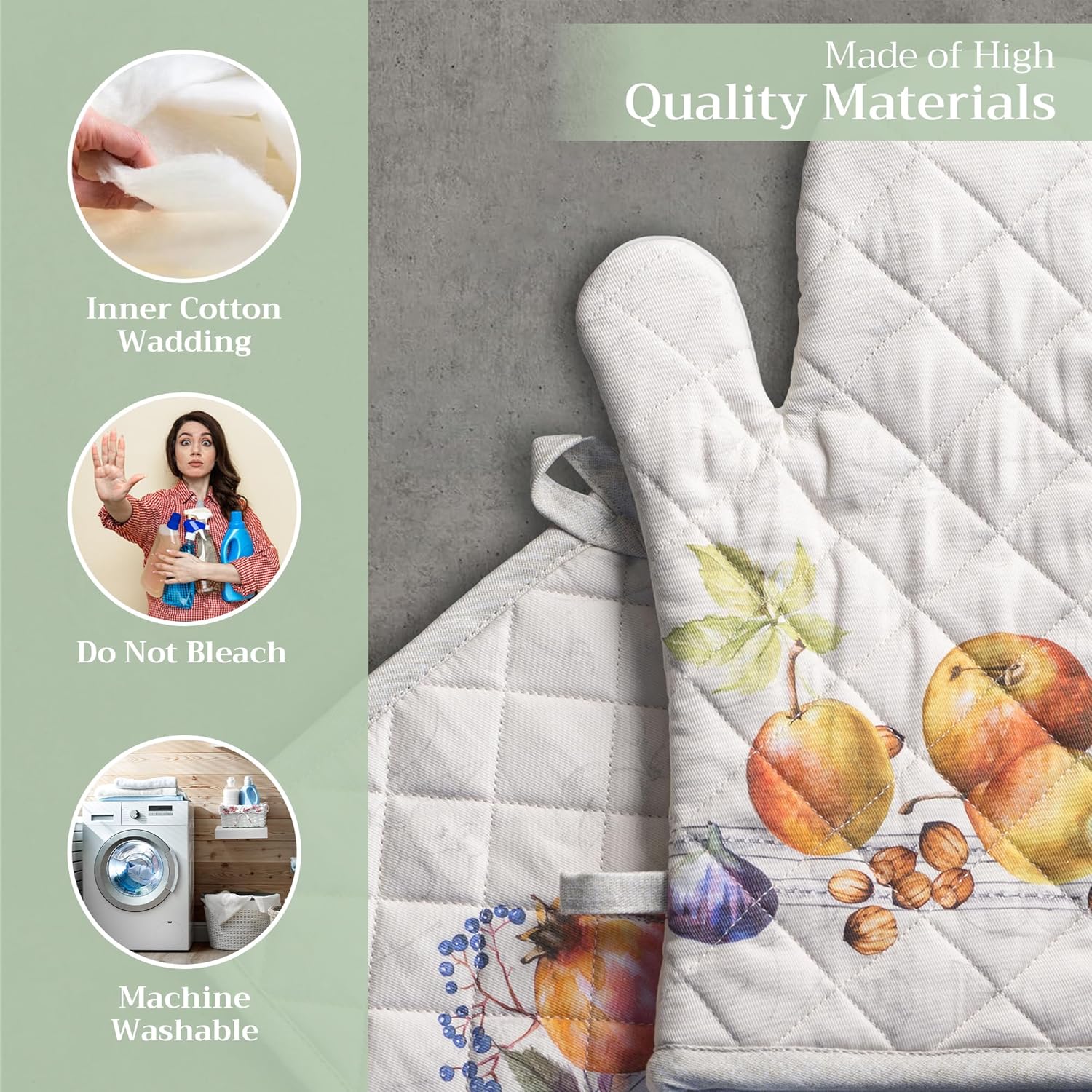 Maison d' Hermine 100% Cotton Oven Mitt & Pot Holder Set (7.5"x13" & 8"x8") Heat Resistant BBQ Cooking Gloves with Loop, Baking, Grilling, Kitchen, Handling Hot Pans (Fruit D'Hiver)