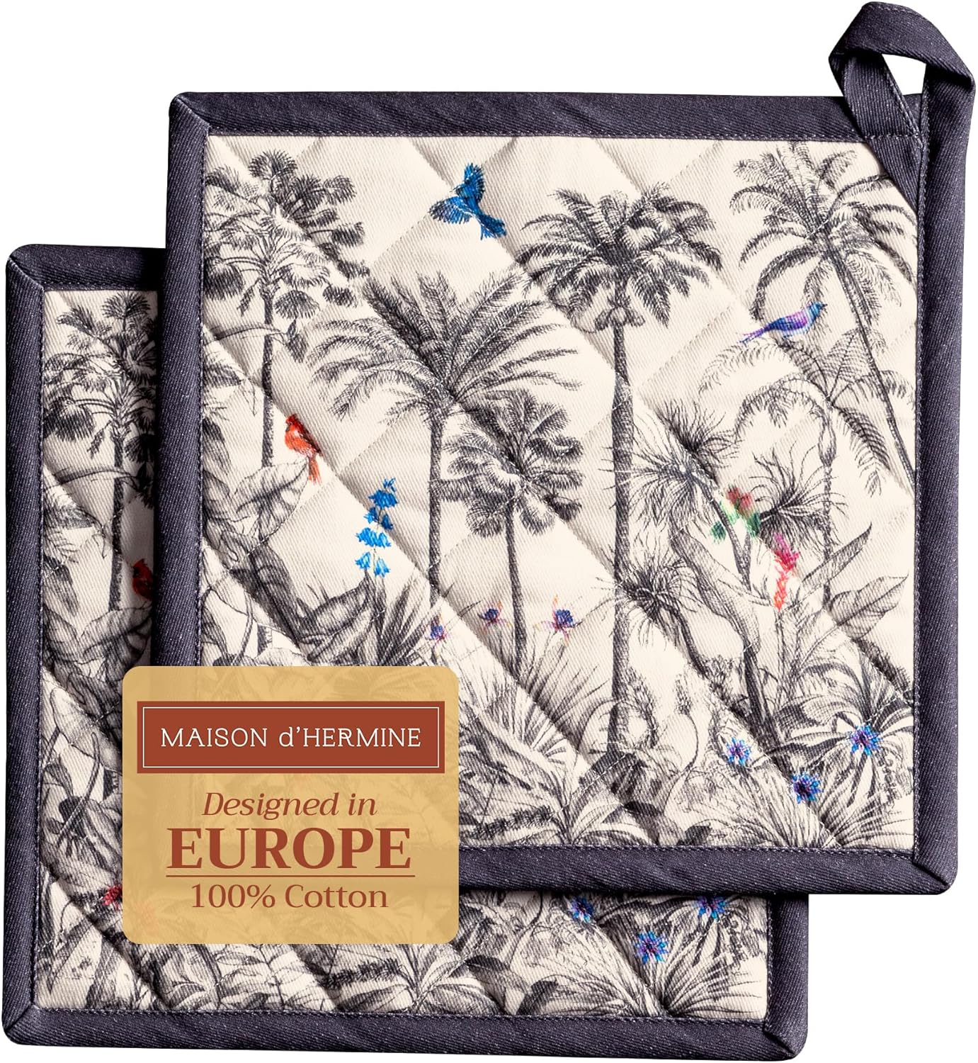 Maison d' Hermine Pot Holders Set 100% Cotton Heat Resistant Potholders 8" x 8" Hot Pads with Loop BBQ, Cooking, Baking, Grilling, Kitchen, Handling Hot Pans (Pack of 2, Amazonia)
