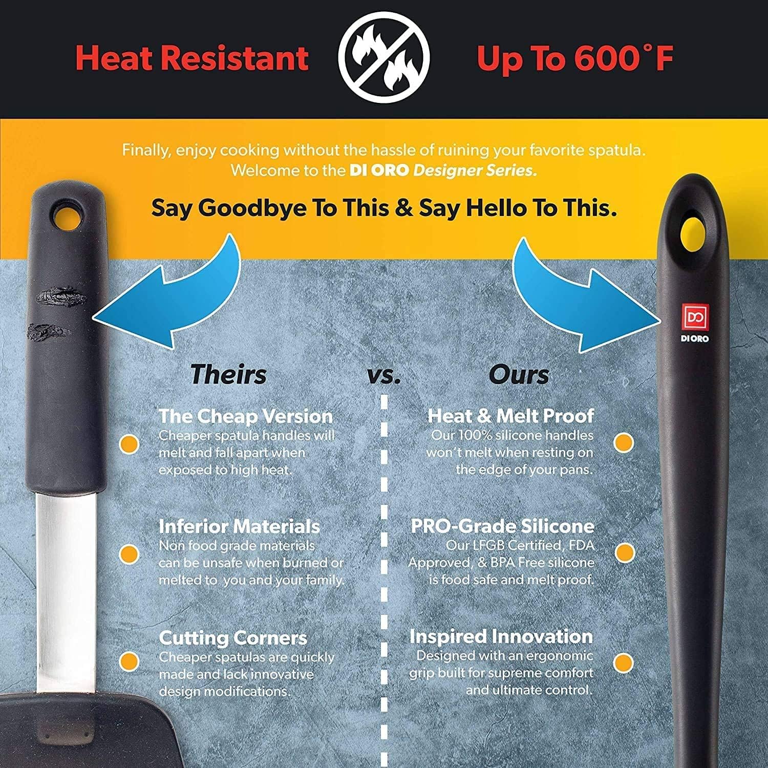 - BIGGER. BOLDER. BETTER. – It is time stop wishing you had a spatula with the durability, size, and the anatomy of a winner to take on the toughest tasks in the kitchen. The DI ORO Pro 14” Seamless Spatula is a bigger clone of our Award-Winning Large Spatula, and has all the same qualities: heat-resistant up to 600°F, food grade, BPA free and LFGB Certified Silicone, including a litany of other attributes you will quickly realize through daily use.