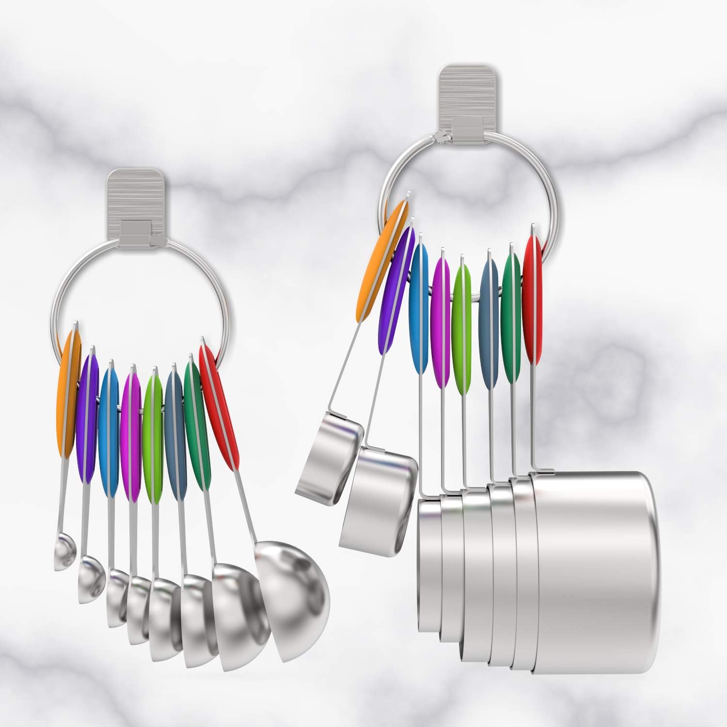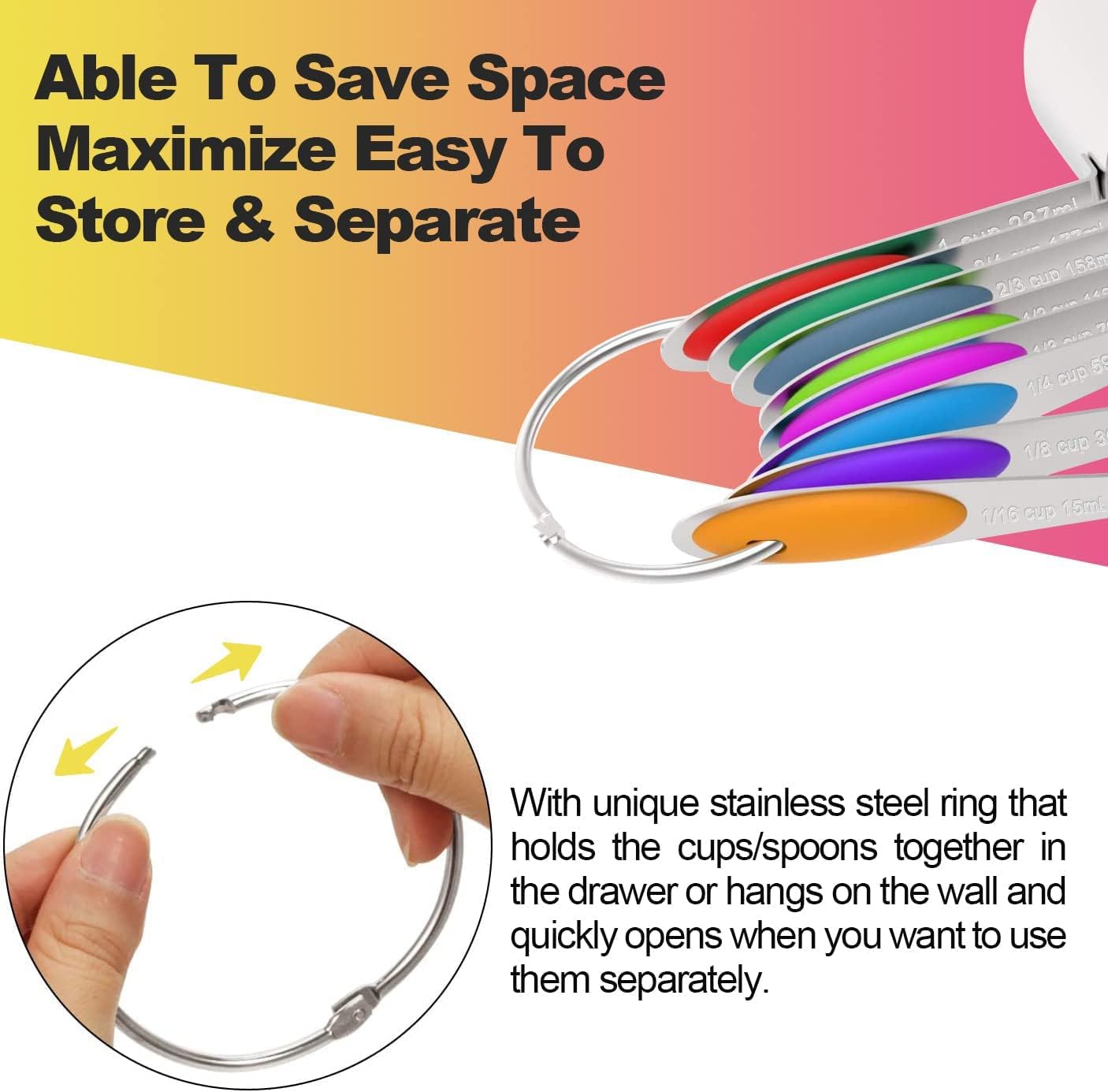 - EASY TO USE: The silicone handle is easy to grasp, non-slip even if use with sweating hands. Heat resistant, protect hands when doing high temperature cooking. The unique stainless steel ring holds the cups/spoons together in the drawer or hangs on the wall and quickly opens when you want to use them separately