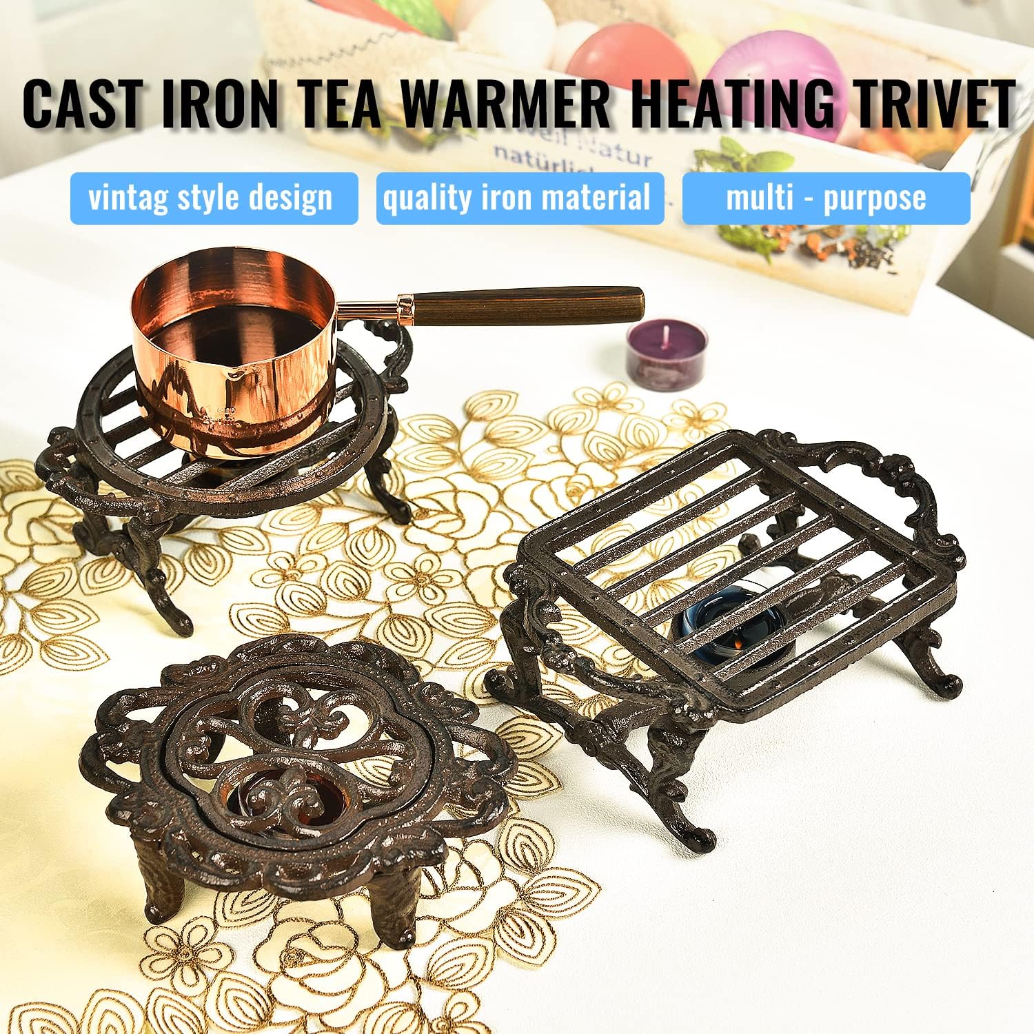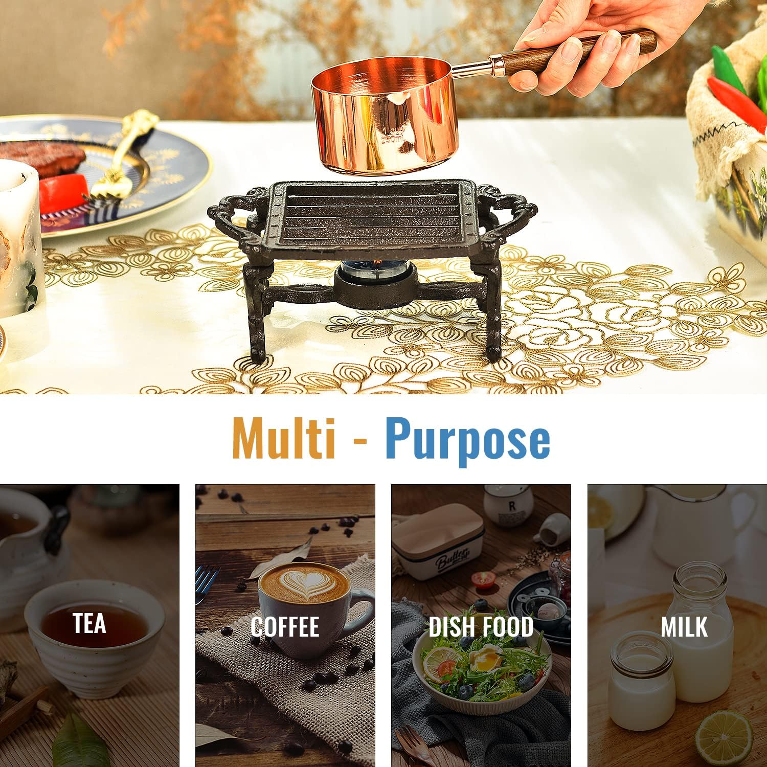 - An vintage home decor.You can call it an alcohol stove,dish warmer,teapot milk coffee warmer,a tealight holder,even a trivet.Very powerful performances.