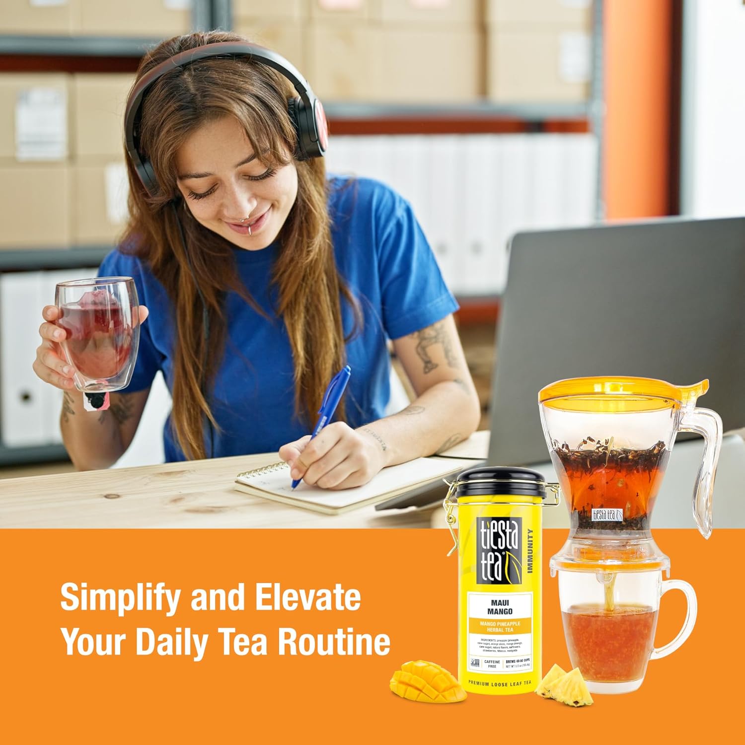 Tiesta Tea - Maui Mango Tin & Infuser Starter Set, Loose Leaf, Premium Herbal Blend, Non-Caffeinated Hot & Iced, 6oz Refillable Tin and 16oz Brewmaster Coffee Bottom Dispensing Tea Infuser