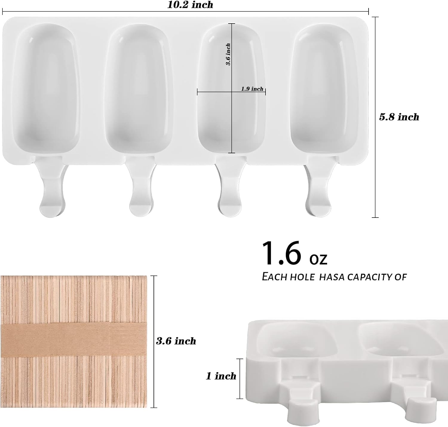 - POPSICLES MOLD DIMENSION: Overall size of ice pop molds appro 10.2*5.5*0.98inch, single cavities size 3.6*1.8*0.98inch, equipped with 50 wooden sticks. using such muli-cavity silicone ice cream mold ,you could make 4 treats at a time,enjoy your happy time with your kids and family.