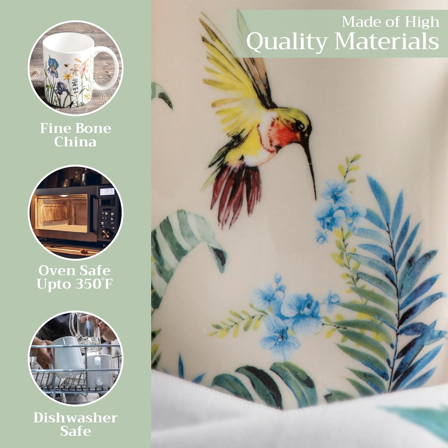 - Easy Care & Maintenance: Microwave, dishwasher, and oven safe up to 350°F. These bone china mugs are built for convenience and durability, making cleanup and reheating simple without compromising on quality