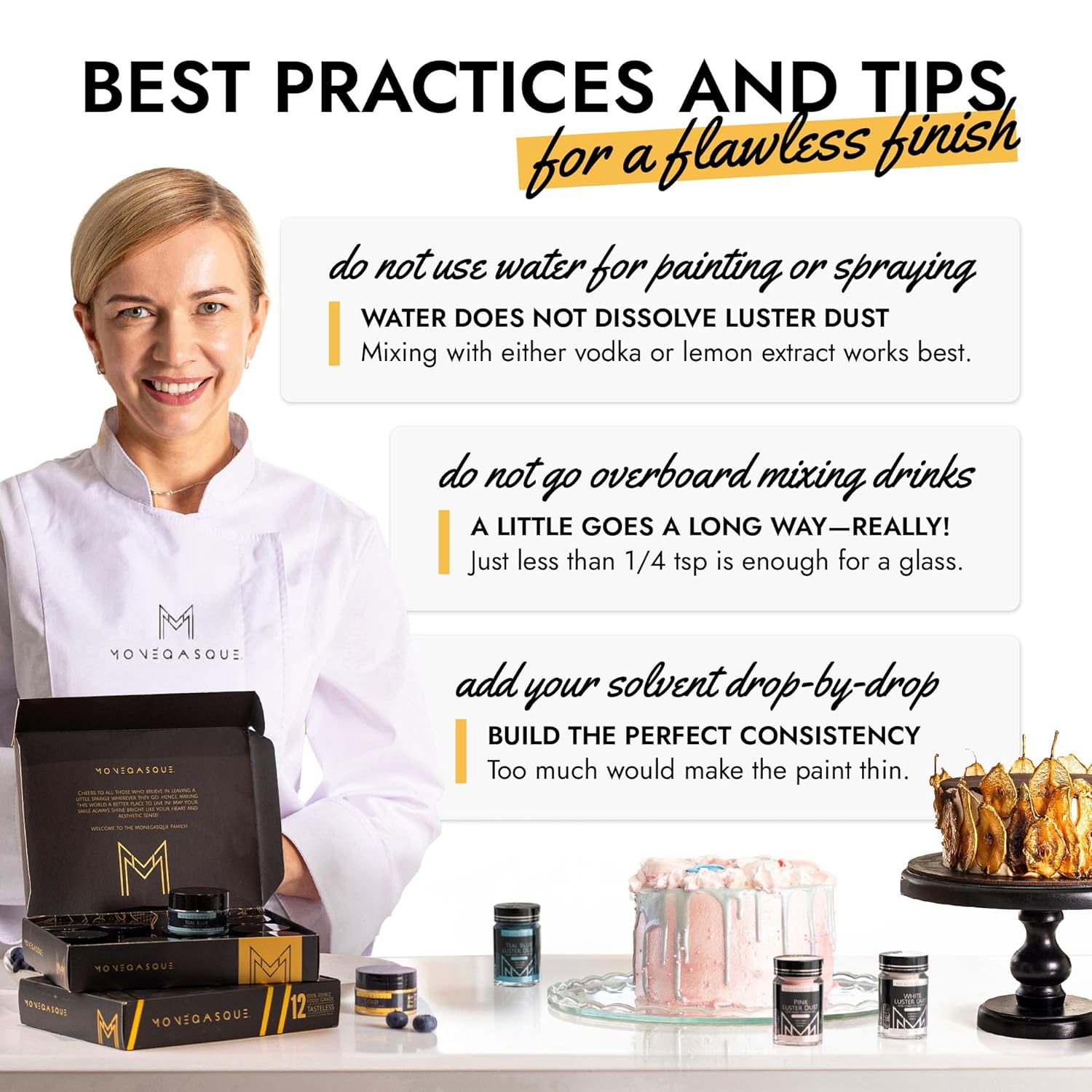 - EASY TO USE: Our gold luster dust is incredibly versatile. Apply with a wet brush, airbrush, or dry brush, and even mix into beverages. Achieve professional-looking results effortlessly at home, whether decorating halloween cakes or adding shimmer to cocktails.
