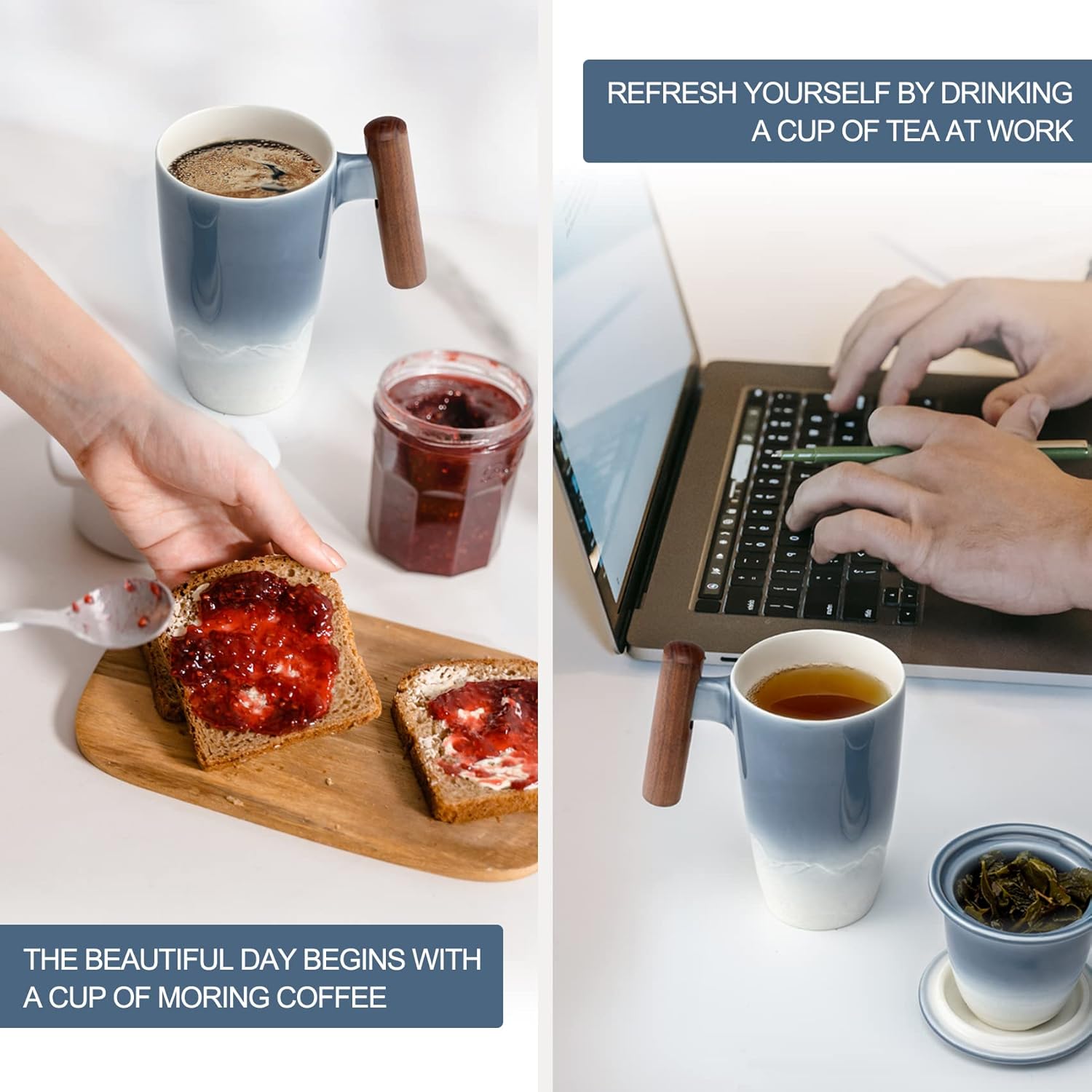 suyika Tomotime Tea Cup with Infuser and Lid 400ml Ceramic Tea Mugs Smooth Inner Wall Wooden Handle 13.5 oz,Blue