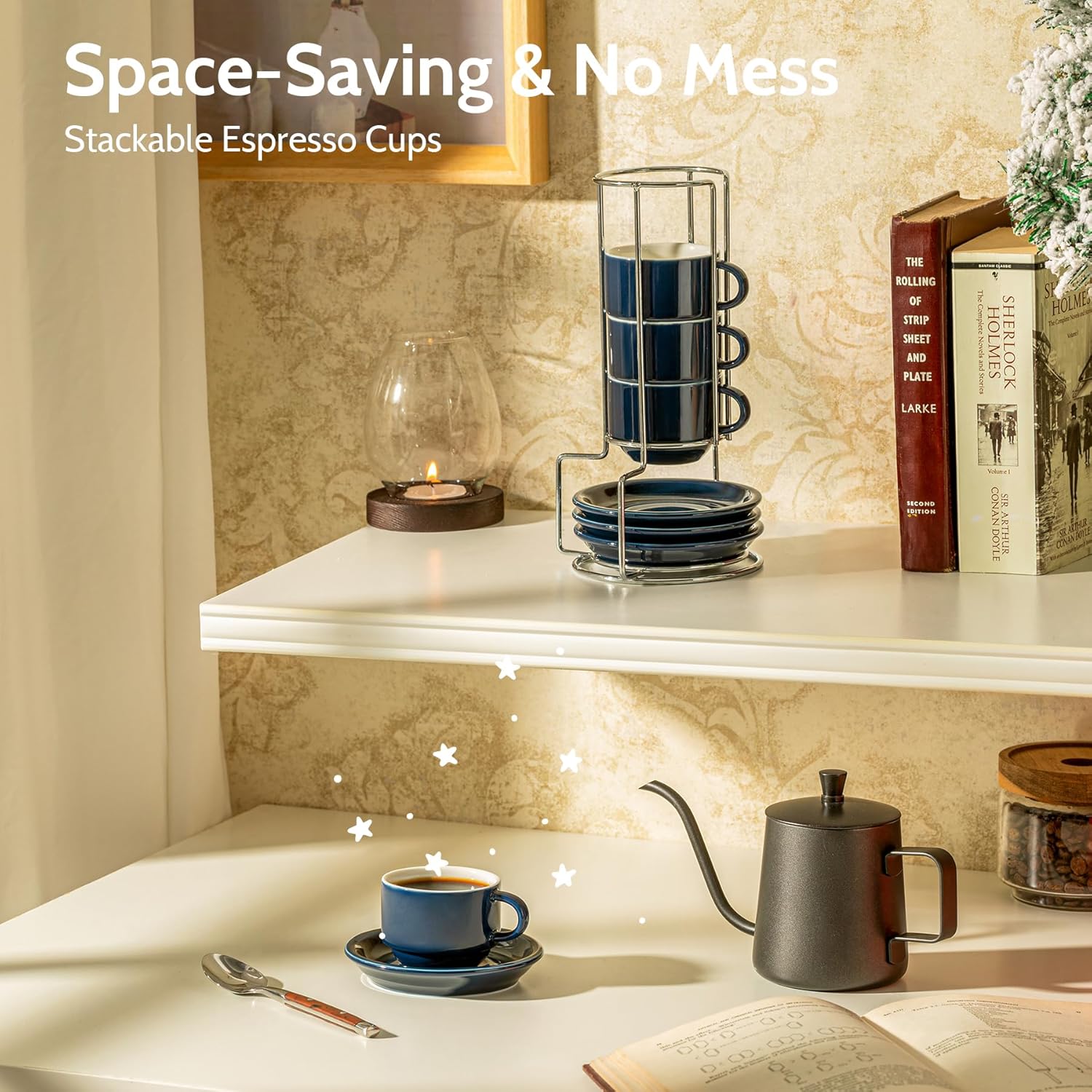 Sweese 4 Ounce Porcelain Stackable Espresso Cups with Saucers and Metal Stand Set of 4, Navy