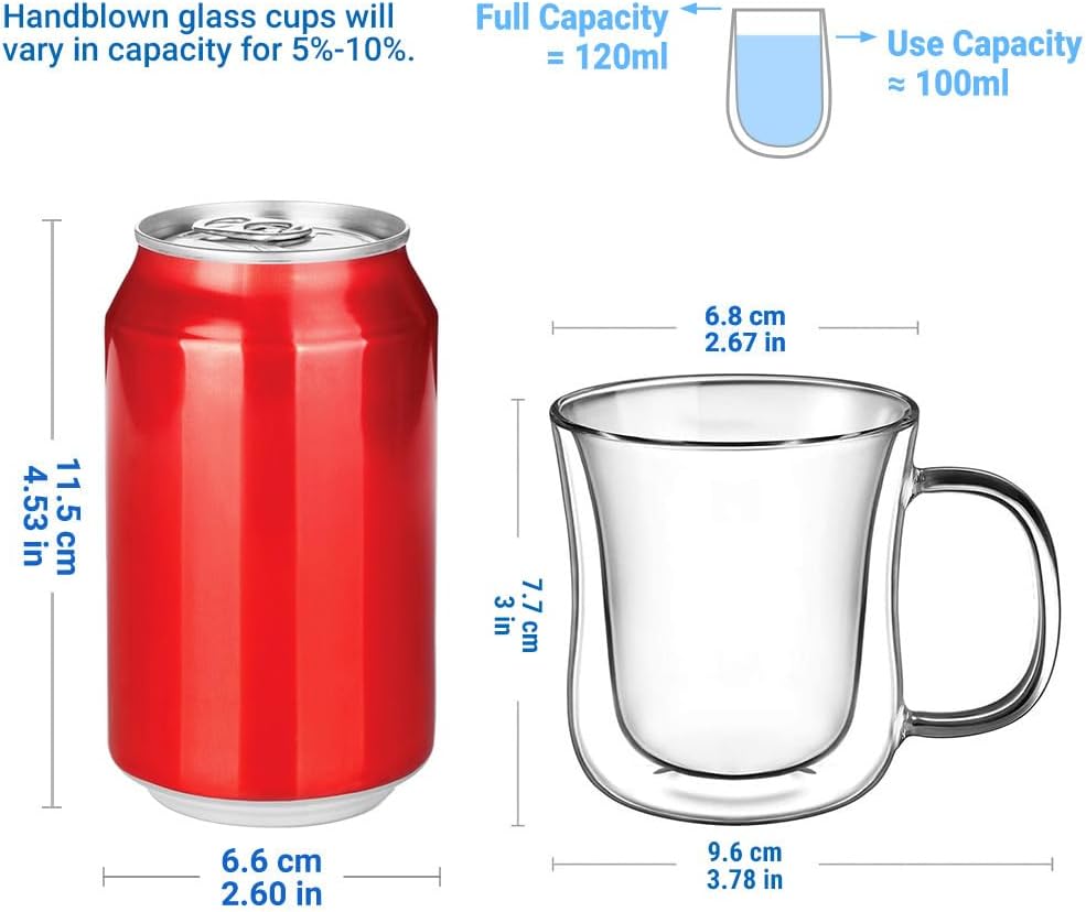 - Capacity: A generous capacity of 4 Oz (full capacity), We recommend that you fill the cup comfortably with 100 ml of liquid. A perfect choice for espresso, tea, desserts
