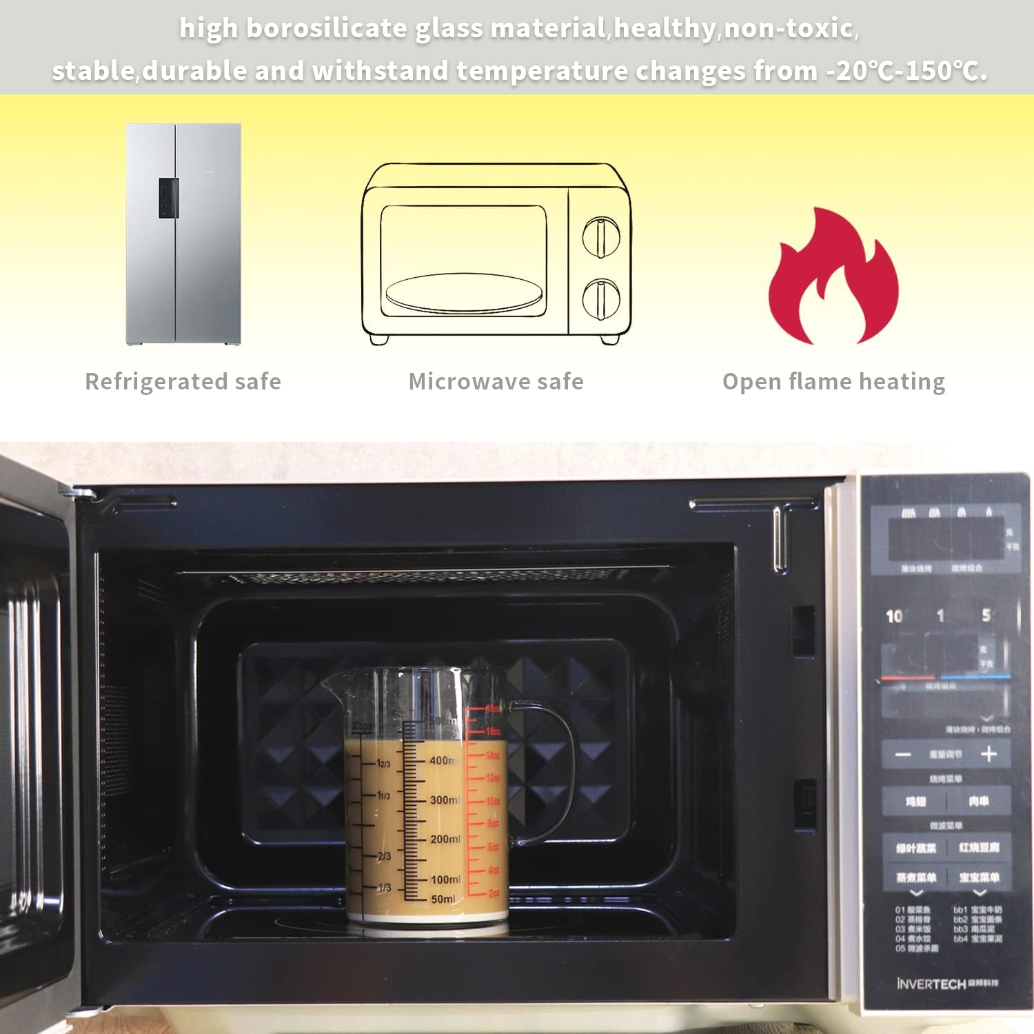 - 500 ML [2 cups]. Made of high borosilicate glass. Suitable for gas stove, microwave oven, electric ceramic stove, oven and refrigerator, not safe in induction cooker
