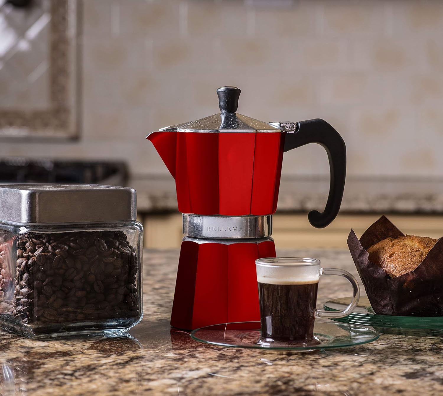 Bellemain Stovetop Espresso Maker | Italian Moka Pot Espresso Maker, Classic Aluminum Design Mocha Pot for Home Brewing & Camping | Easy to Use & Clean - 3-Cup, Red