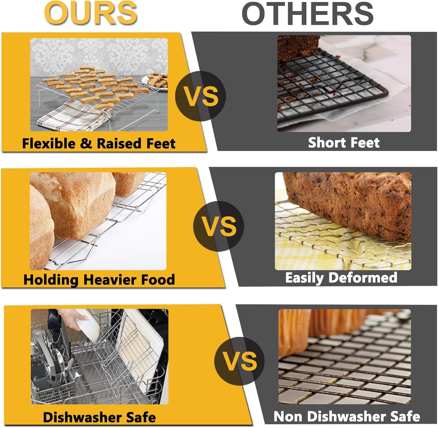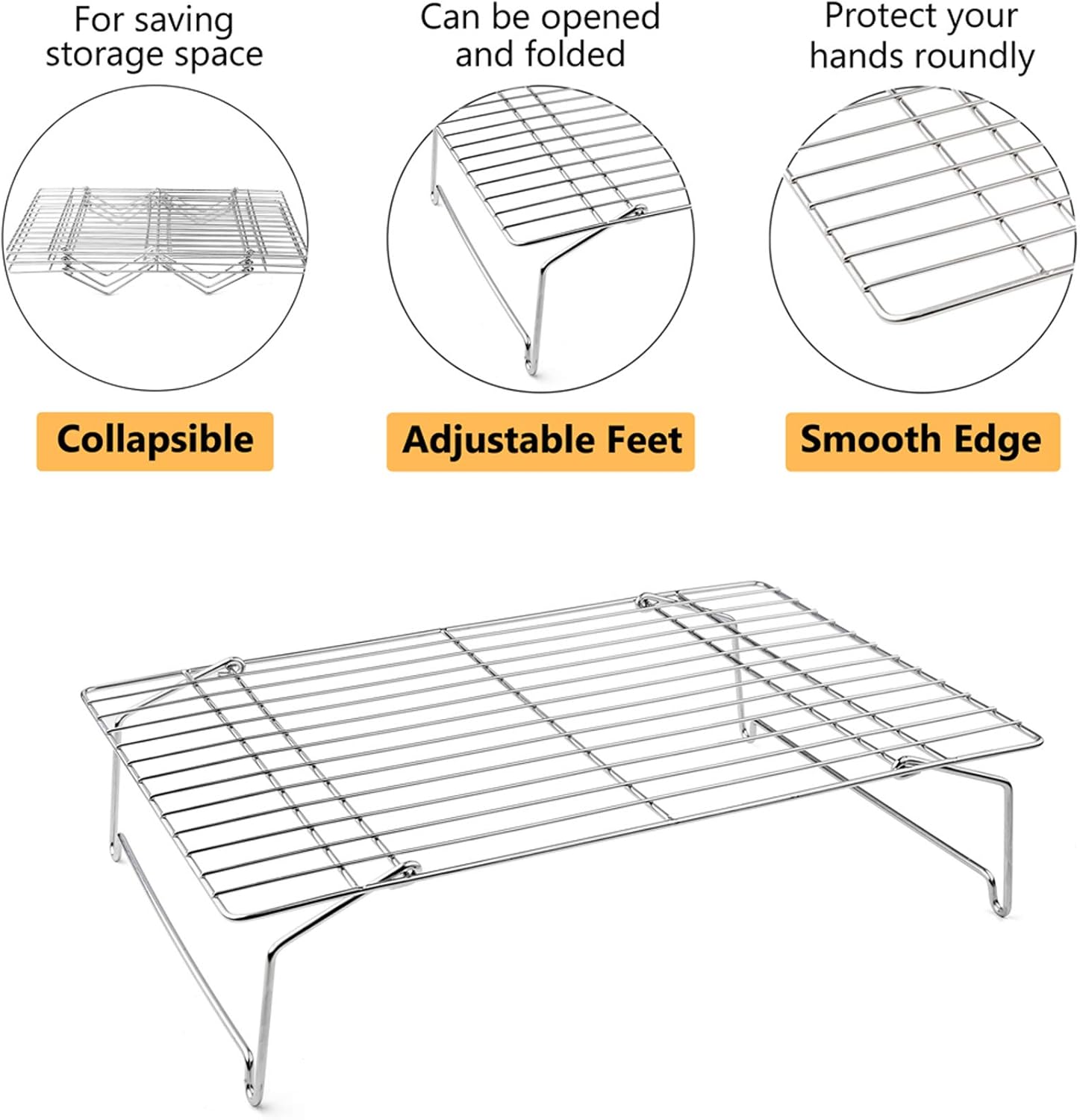- ▶SUPERB WORKMANSHIP◀ The parallel lines are solidly and densely welded to keep food from falling through, The feet with the arc design help the cooling rack stand stably without sliding, Smooth edges without sharp angles, Roundly protect your hand, Mirror finished surface always keep a shiny appearance