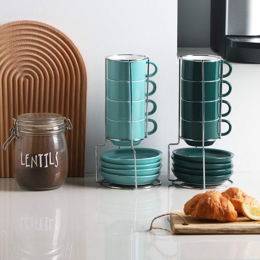Sweejar Porcelain Espresso Cups with Saucers, 4 Ounce Stackable Cappuccino Cups with Metal Stand for Coffee Drinks, Latte, Tea - Set of 4 (Jade)