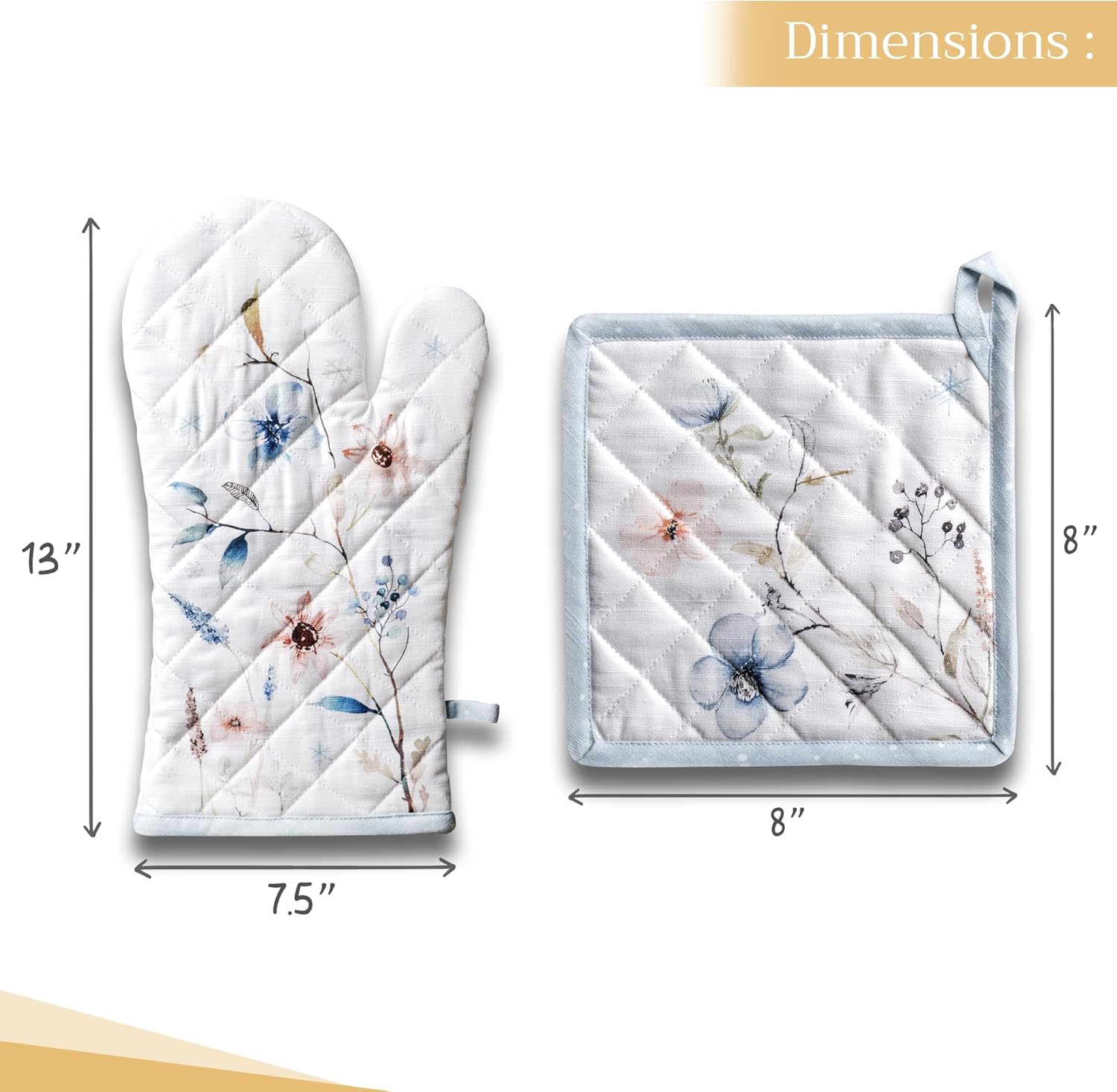 Maison d' Hermine 100% Cotton Oven Mitt & Pot Holder Set (7.5"x13" & 8"x8") Heat Resistant BBQ Cooking Gloves with Loop, Baking, Grilling, Kitchen, Handling Hot Pans (Ice Florals)