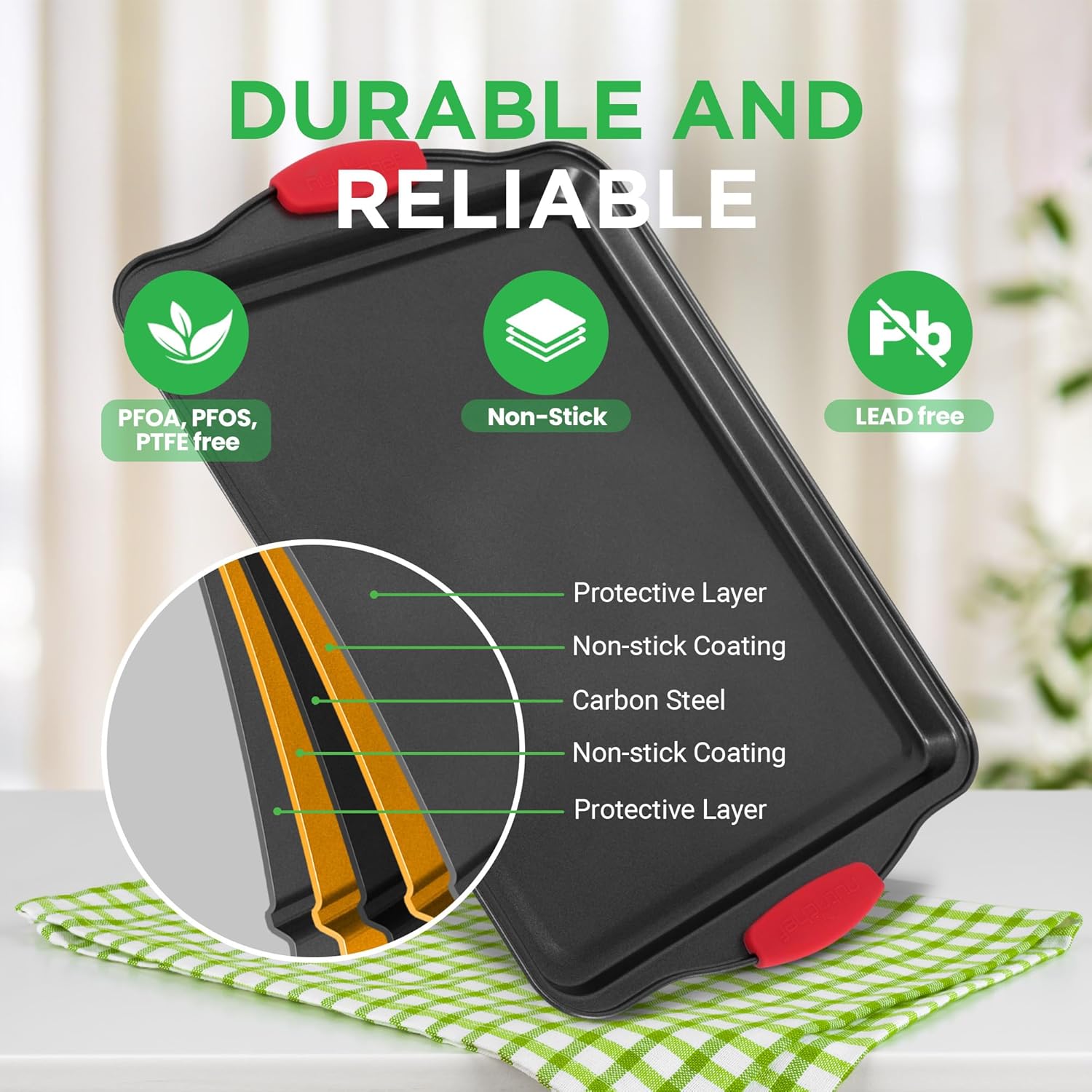 - DURABLE BAKEWARE SET: These cookie pans are made from carbon steel & non-stick coating that resists warping to keep your baking, roasting & toasting for years. It is suitable for the oven, refrigerator, and freezer. A reliable cookie sheet oven pan style