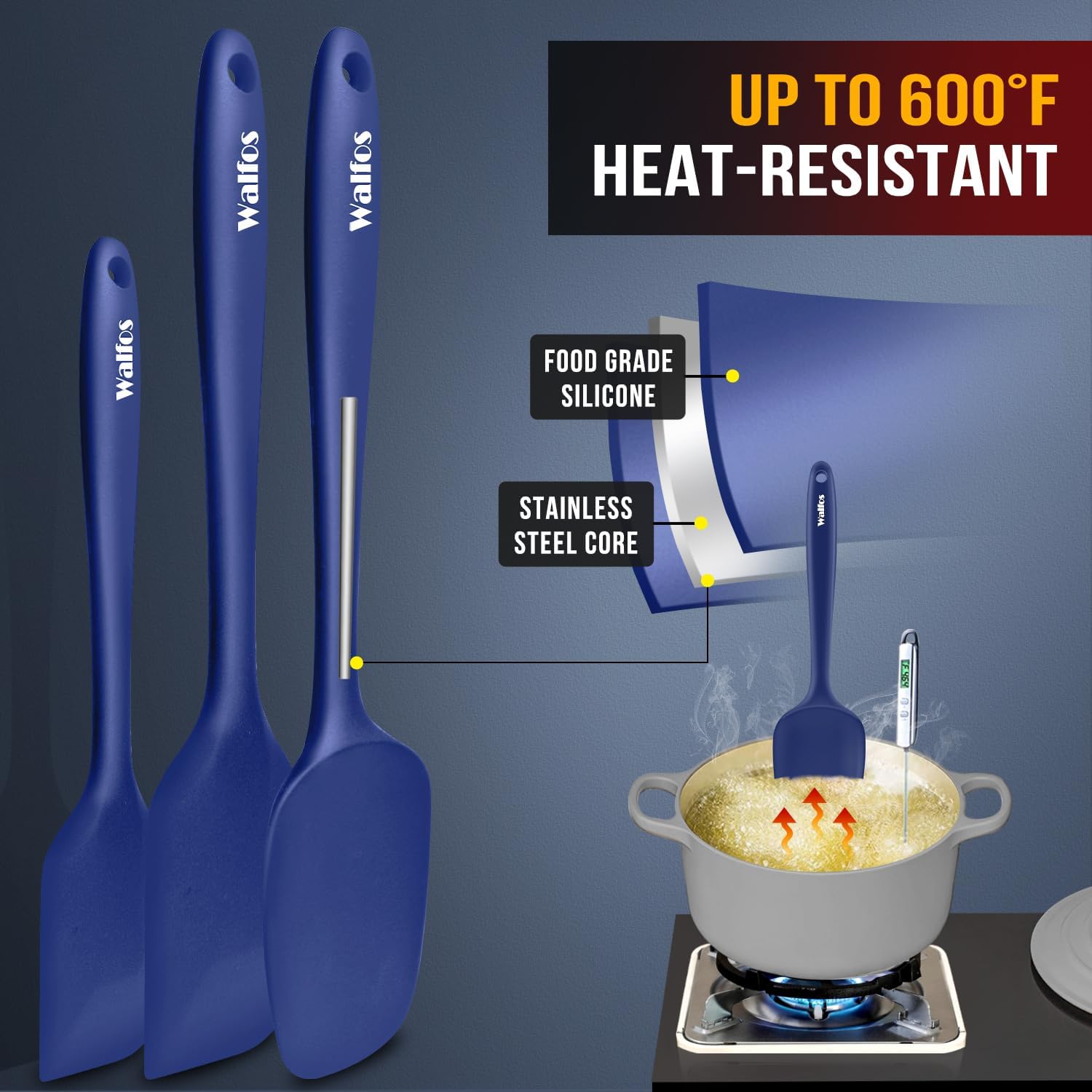 - 【Highly Heat Resistant, BPA Free!】Walfos spatulas are made of premium food grade silicone, BPA free, 600° heat resistant, non-stick surface. Perfect for cooking, baking, scraping, decorating or mixing, safe and good for your health and protect your cookware from scratching.
