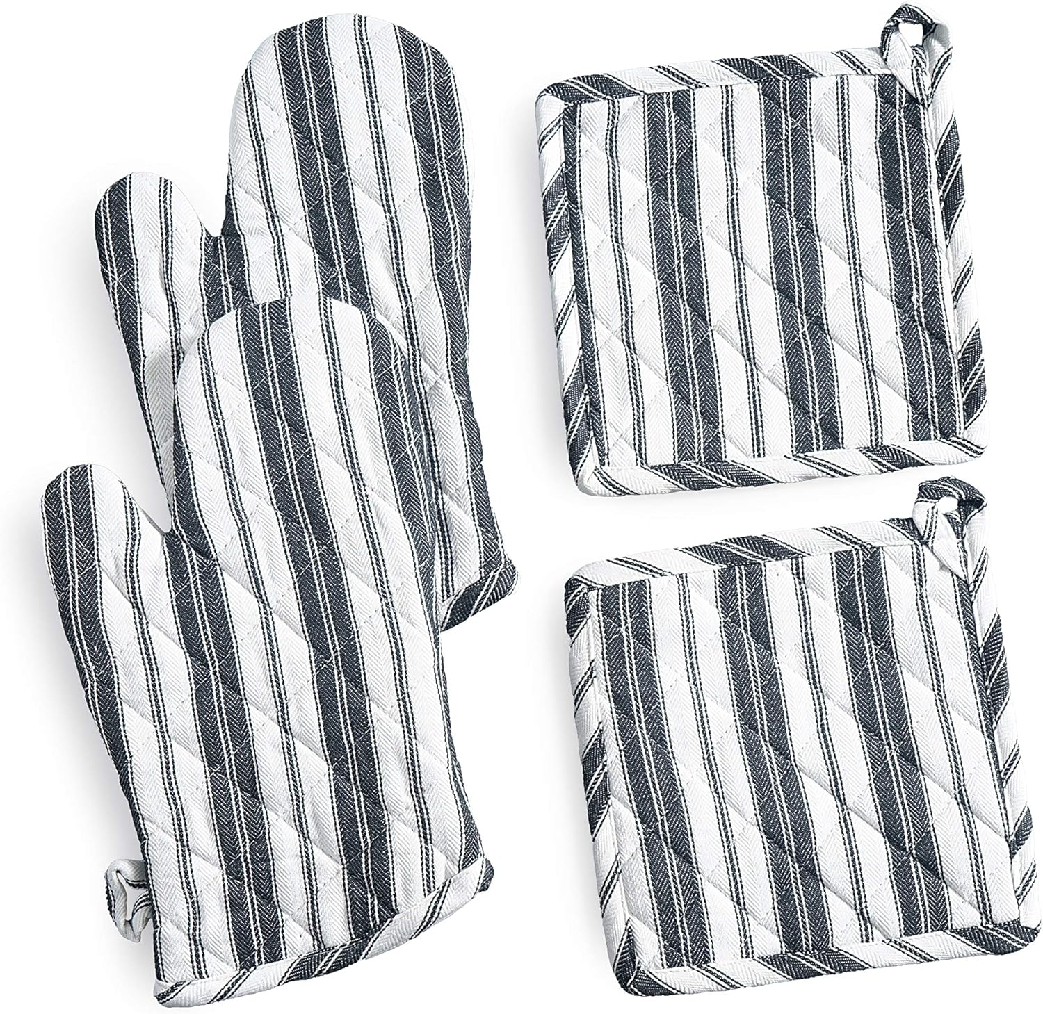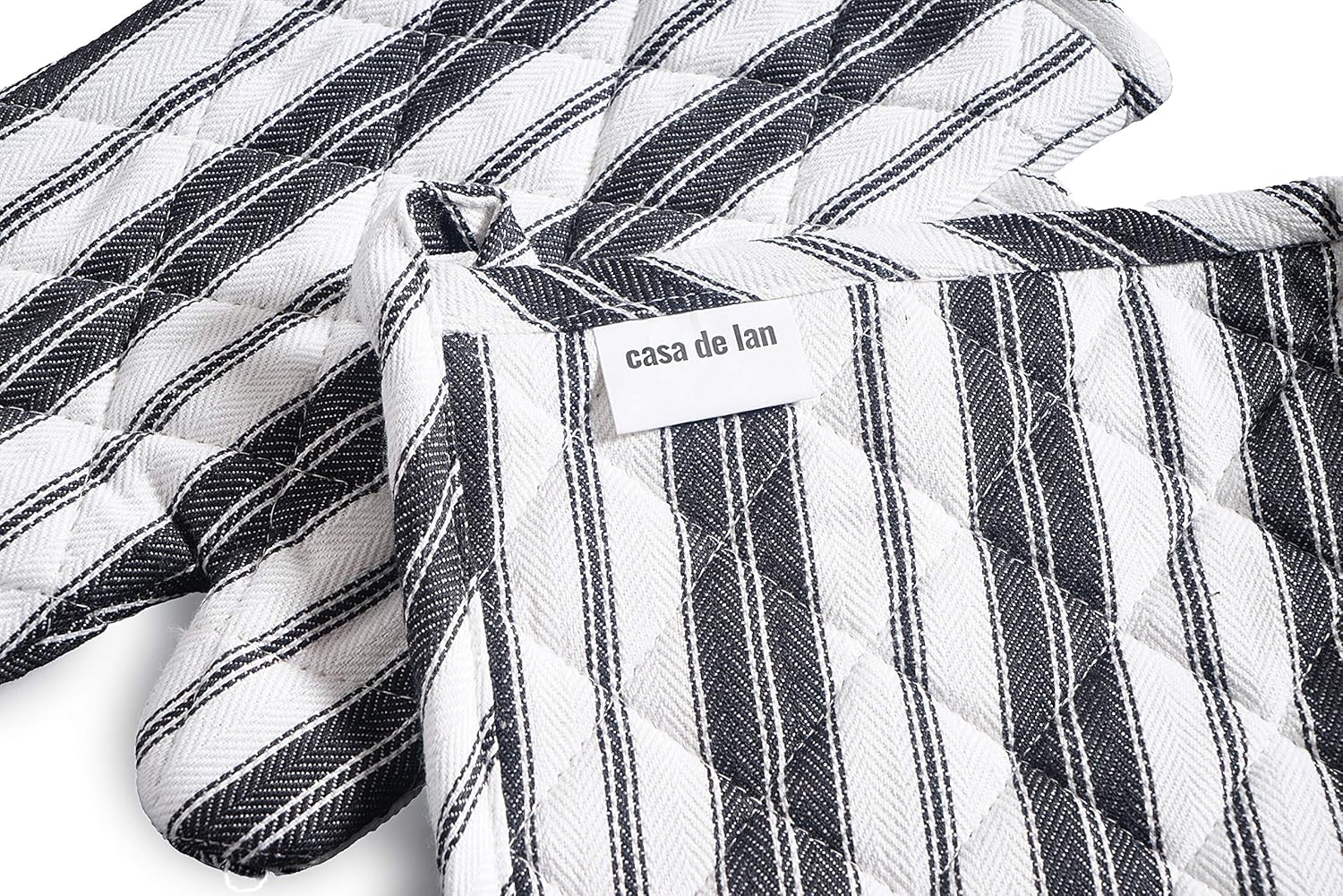- Oven Mitts & Potholder Set - Durable Heat Resistant Gloves - Thick Mittens for Kitchen - Suitable for Cooking, Baking, Grilling - BBQ- 2 Oven Mitts & 2 Potholders - Black Stripes - Casa De Lan