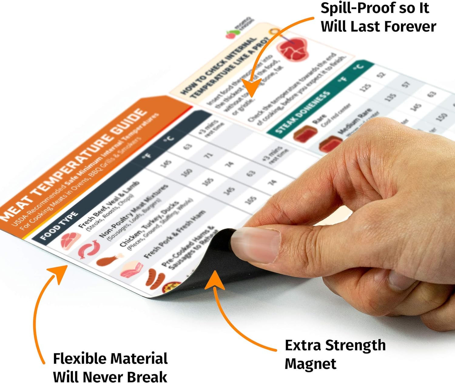 - Durable, Water-Resistant Meat Temperature Chart Magnet. Crafted with a glossy, wipe-clean surface, this meat temp magnet resists wear and keeps your food safety knowledge looking sharp. Designed for real use on smokers, grills, or ovens, its strong magnetic backing sticks securely to any metal surface, making it a durable cooking temperature reference for home cooks and BBQ enthusiasts alike.