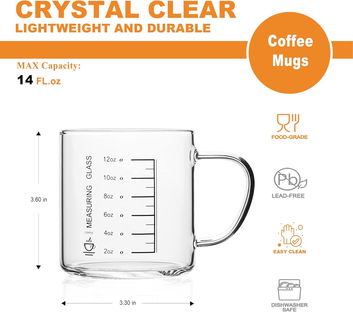 - PERFECT LARGE CAPACITY:This clear crystal glass coffee cup has extremely high visibility,suitable for displaying coffee artwork,you can easily see the coffee color in the glass.In addition,the large 14 ounces give you plenty of room to mix and match with milk powder and sugar.Prefect used for Capucinno cups,Macchiato,Latte mug,Espresso cups,Demitasse cups,Tea mugs,Smoothie and Milk Glasses,Drinking Glasses,Beers Glasses,Hot Chocolate,Mulled Cider and Juice,Perfect for hot or cold Drinks