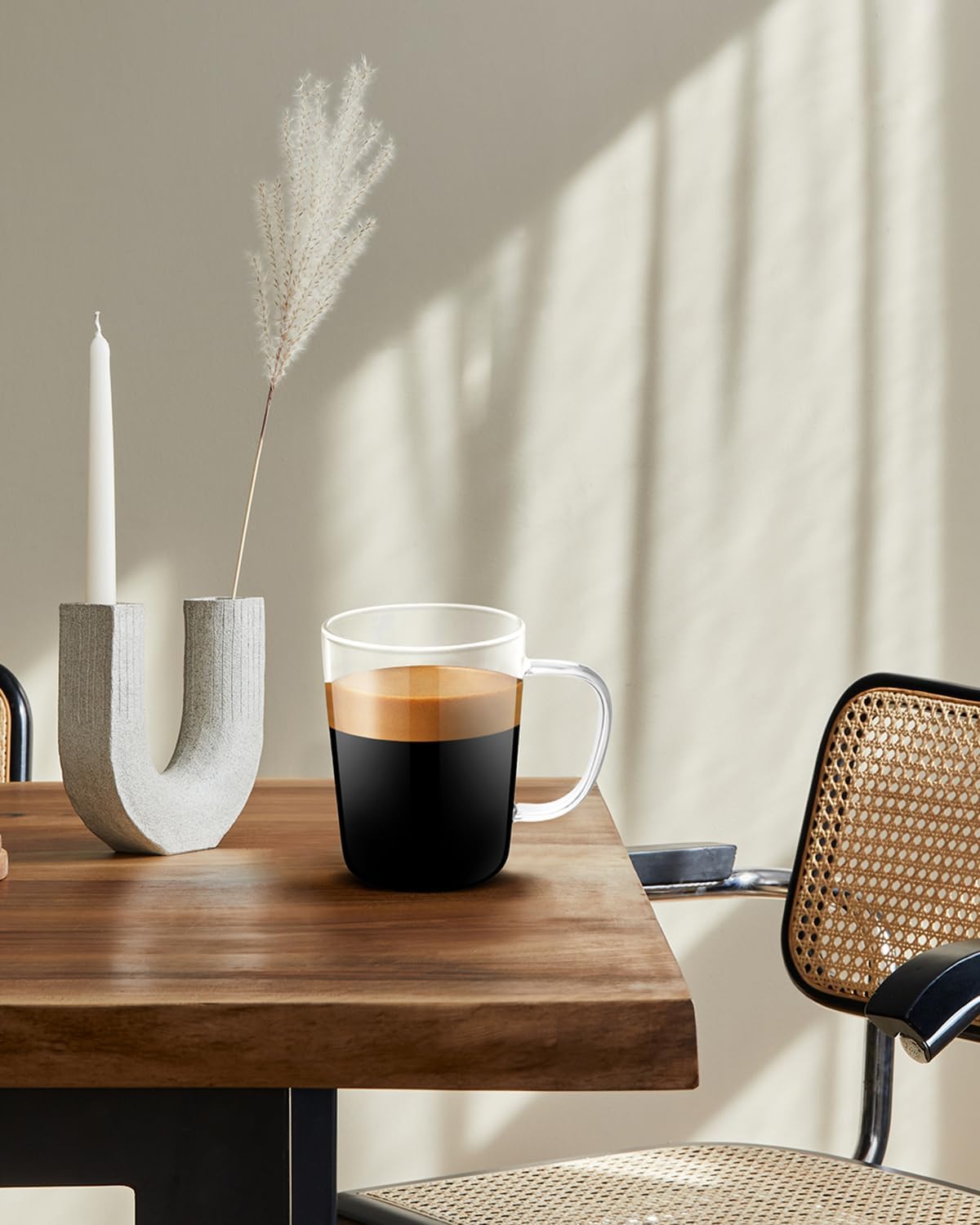 - MULTIFUNCTIONAL GLASS:Modern coffee mug gifts set,these mugs are crystal clear,light weight and the perfect size.Can be used for Capucinno cups,Lungo cups,Macchiato,Latte,Espresso cups,Demitasse cups,Tea,Smoothie,Drinking Glasses,Beers,Hot Chocolate,Mulled Cider and Juice,Perfect for hot or cold Drinks.