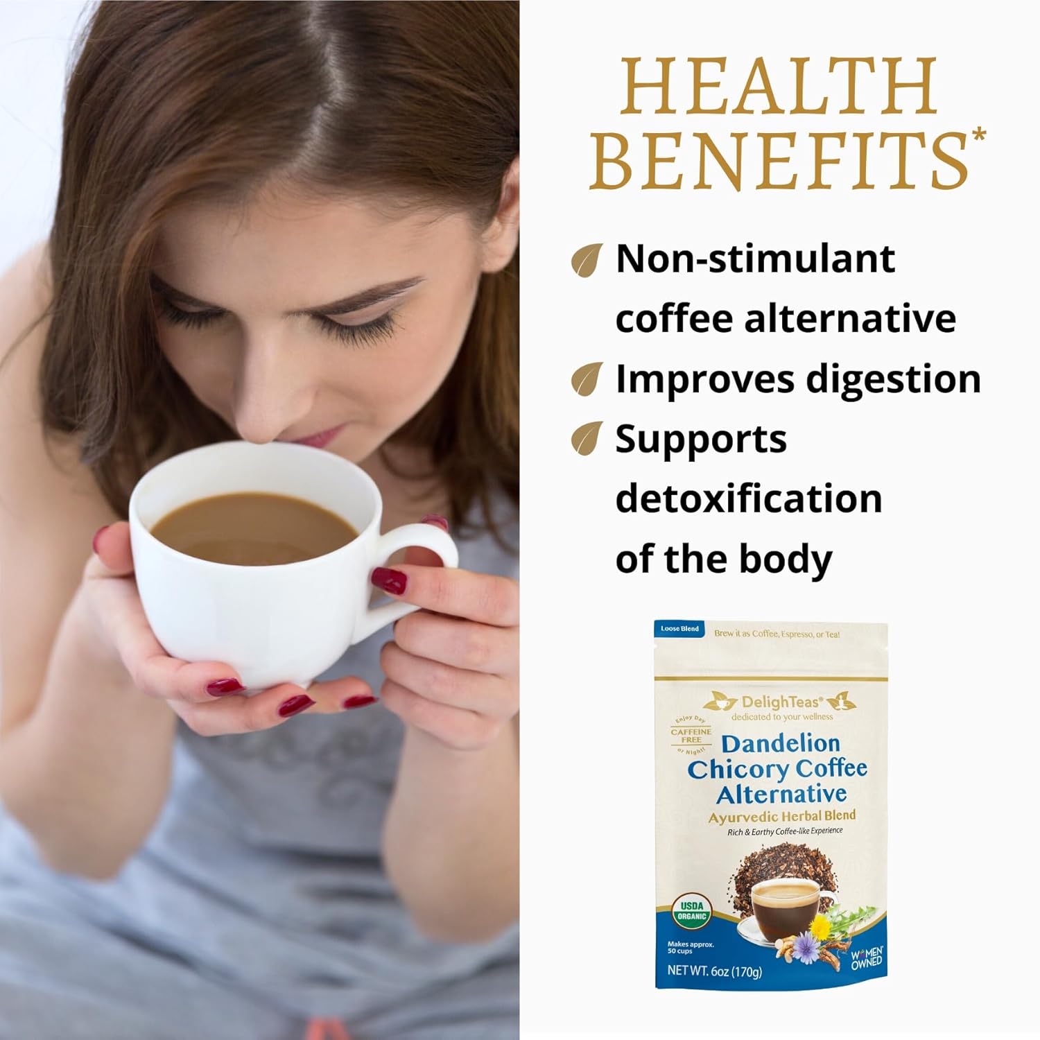 DelighTeas Organic Coffee Alternative | Ayurvedic Herbal Chicory Dandelion Coffee | Coffee Substitute | USDA Organic, Caffeine Free, Gluten Free | With Sweet Notes of Carob | 50 servings, 6oz.
