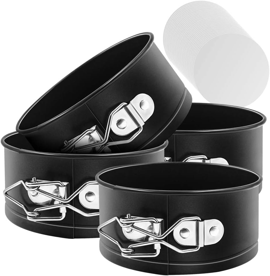 Springform Pan Set, 4-Inch Mini Cake Pan 4 Pack with 50 Pcs Parchment Paper Liners, Nonstick Leakproof for Mini Cheesecakes, Pizzas and Quiches