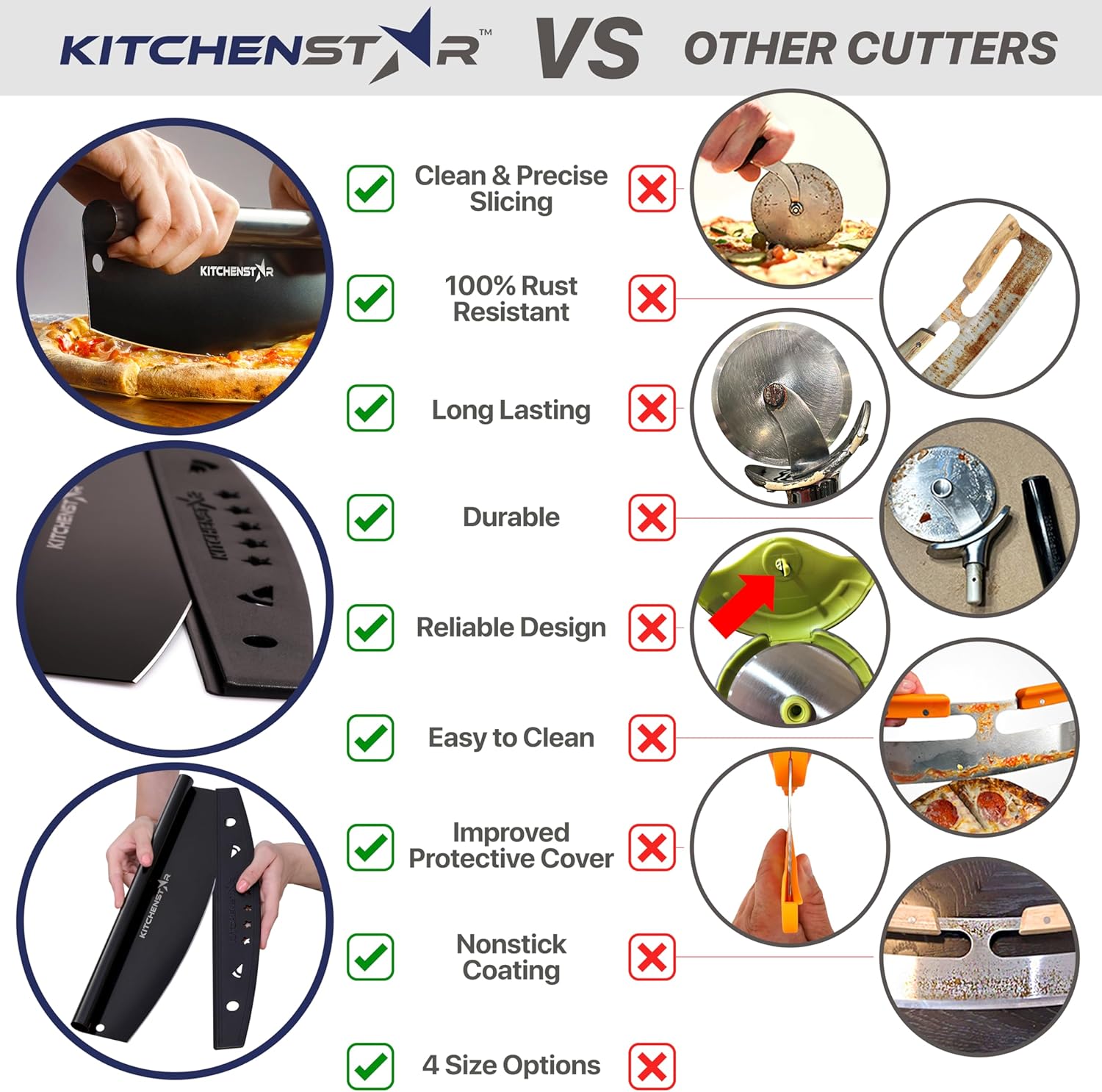 KitchenStar 18-Inch Pizza Cutter Rocker Blade - Sharp Stainless Steel Slicer Knife, Protective Cover, Black Nonstick, Extra Large - Commercial Pizza Oven Accessories