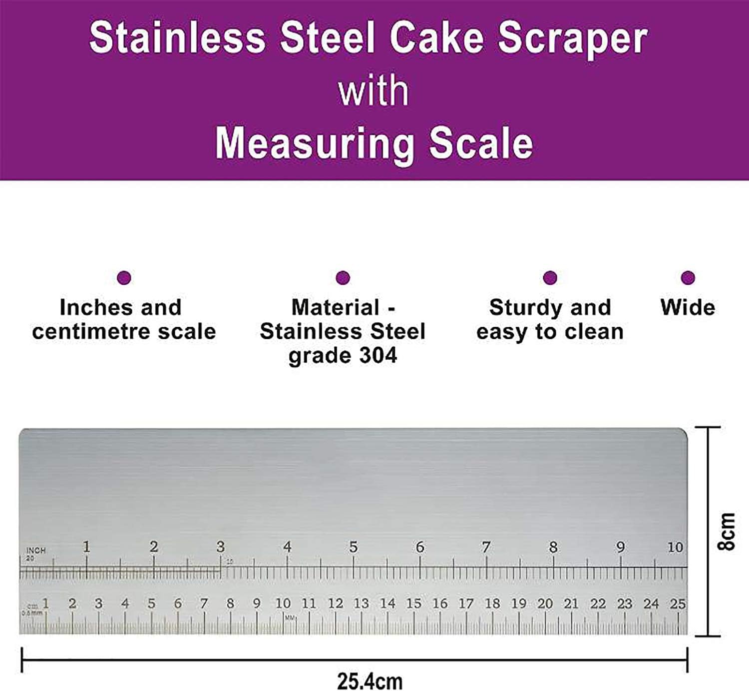 - Make your cake safe & easier: This cake scraper smoother material is food-grade stainless steel 304 , 25.4cm X 8cm is griped comfortably in your hand
