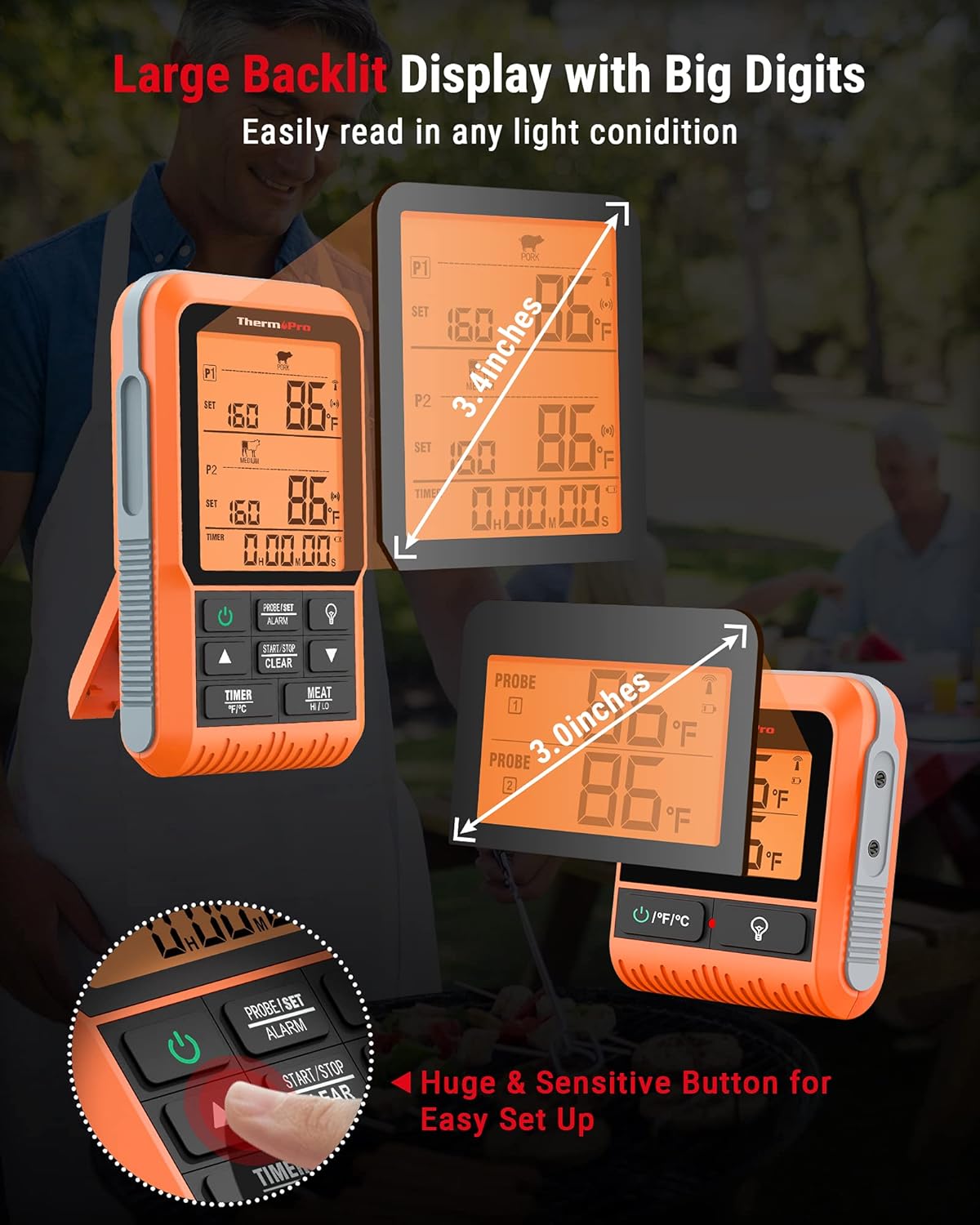 - Dual Meat Temperature Probes: Digital food thermometer features high heat resistant meat probes, measuring temp range from 14℉ to 572℉ with an accuracy 1.8°F/1°C to let you Cook Like a Pro