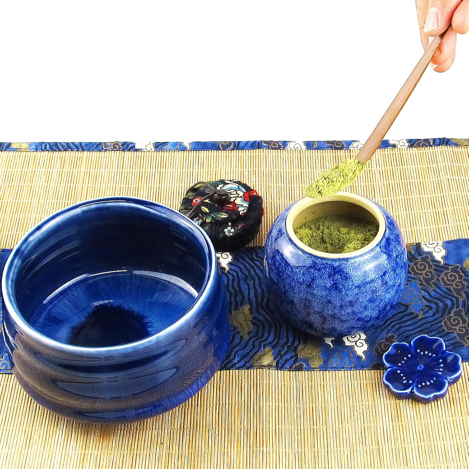 - COMPELETE SET: Matcha bowl, matcha whisk, whisk holder, traditional scoop, tea spoon, tea cloth, bamboo holder, scoop holder, matcha powder caddy, matcha powder strainer, bamboo brush and bamboo screen