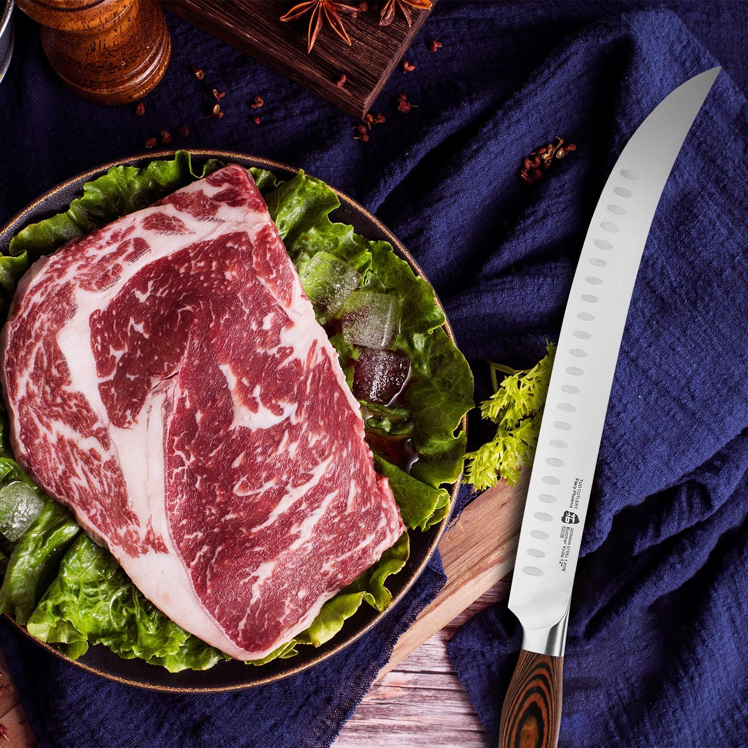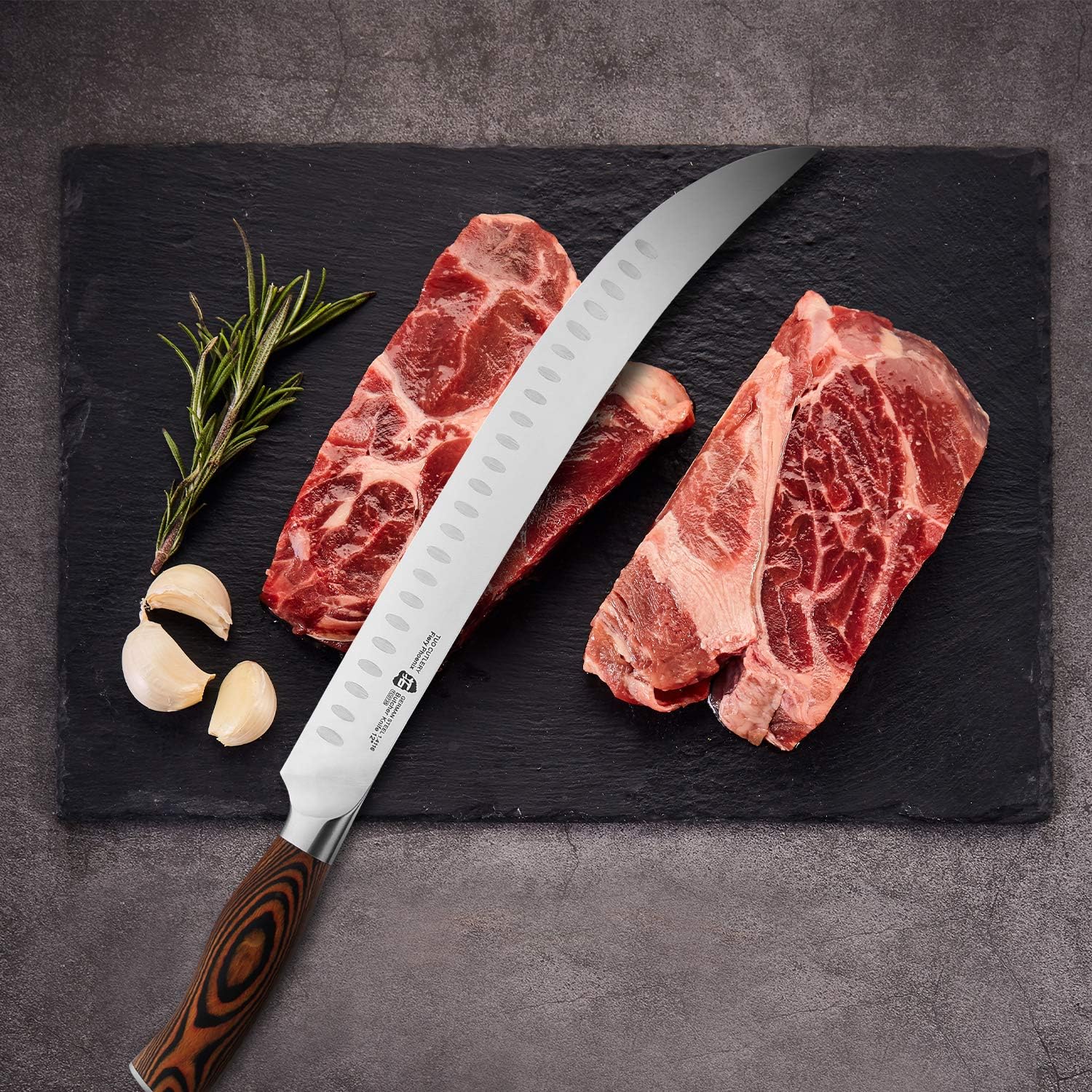 - VERSATILE USE: This 12-inch extended butcher knife is expertly crafted and thoughtfully designed to masterfully slice through flesh, break through cartilage and trim fat from beef, poultry, fish and other meats, no matter how hard your meat, you can cut through it easily and effortlessly. More importantly, it comes with an exquisite box, which you can use as a gift to your family or friends.