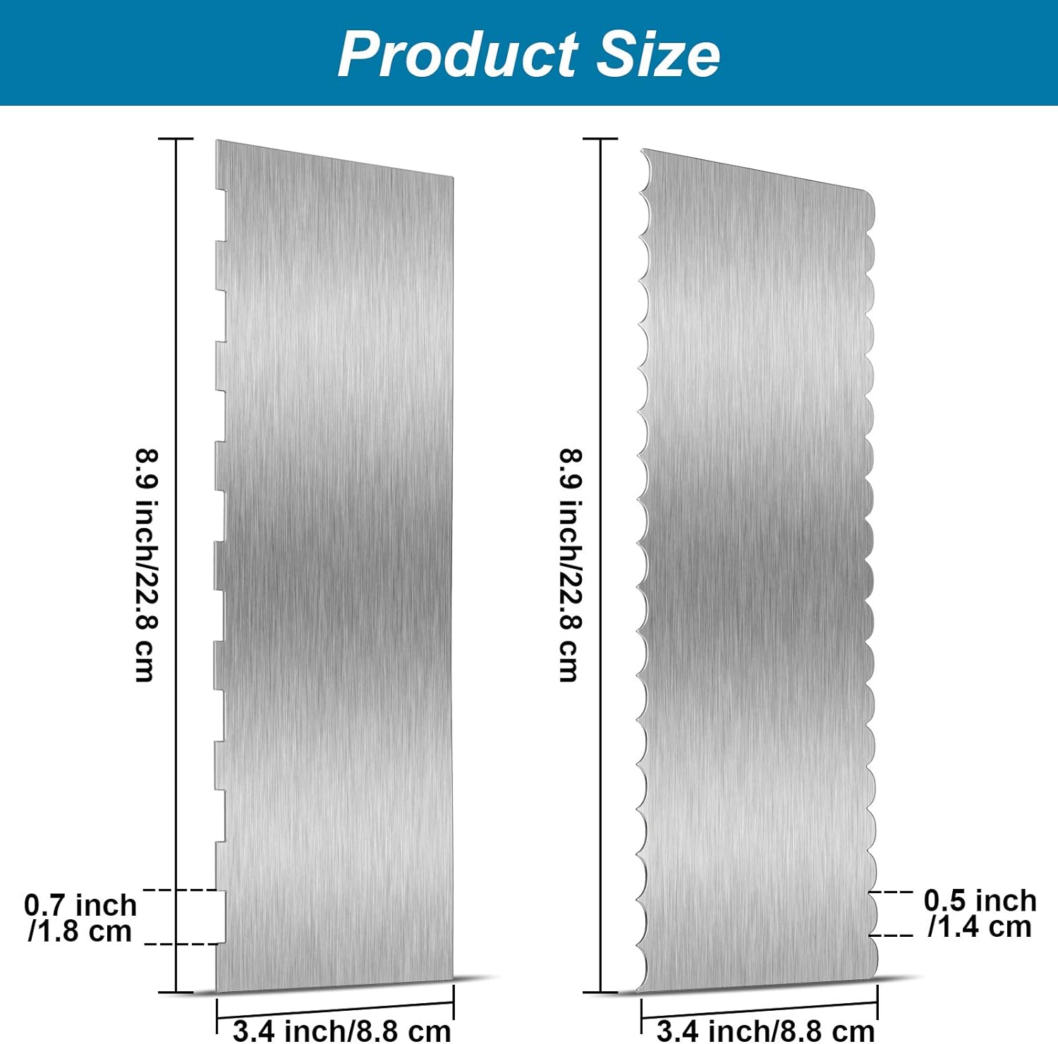 - Double sided design: the cake smoother scrapers are designed with two edges, one side is smoother, the other side is square patterned edge, it will create beautiful buttercream stripes design on your cakes.