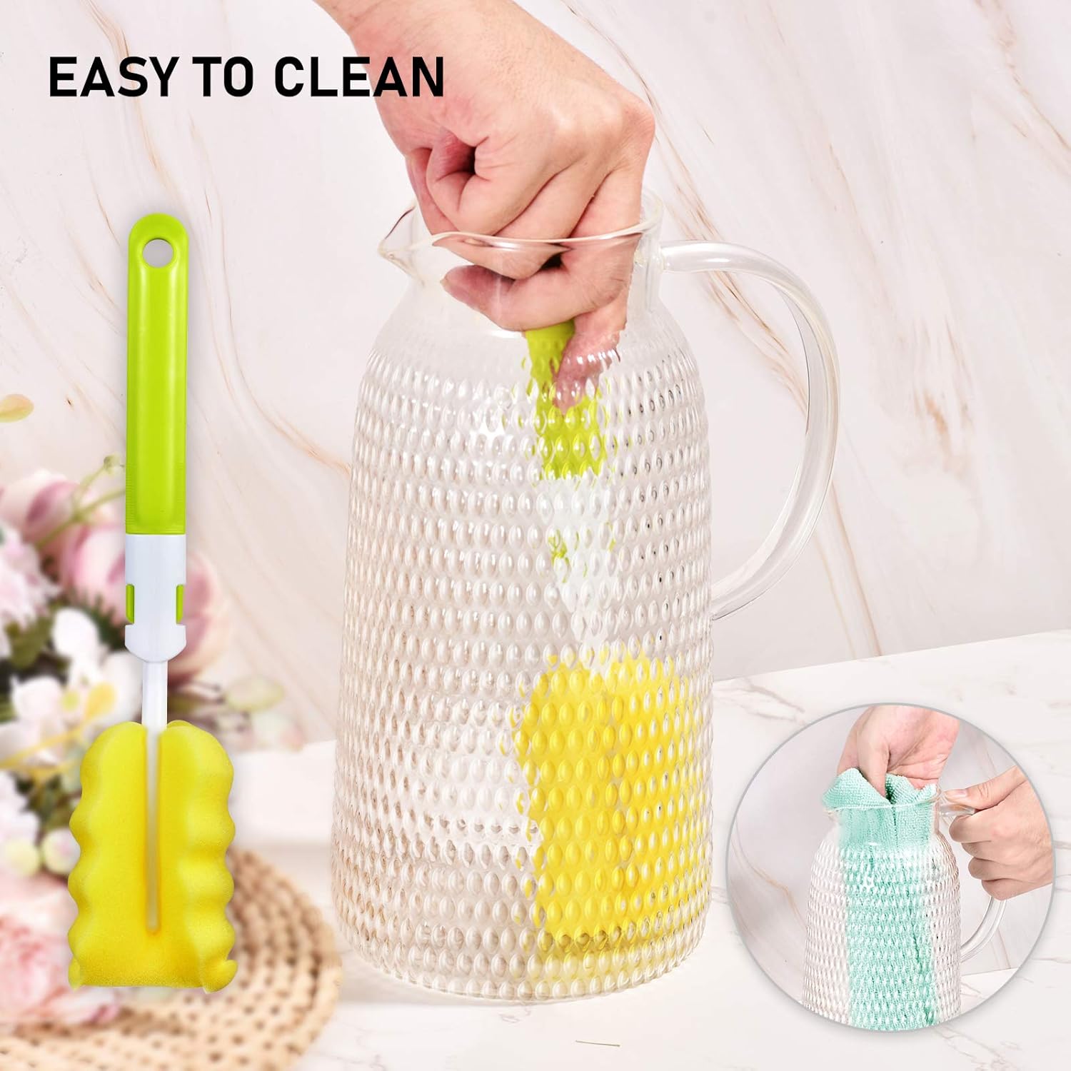 - EASY TO FILL AND CLEAN - You may want to add cut fruit or lemons to your tea or make a fruit infusion. The throat of our carafe is wide enough to allow you can easily add your drinks and fruits inside. The glass pitcher’s wide mouth also makes for easier clean-ups. You can match the sponge brush to clean the glass pitcher.