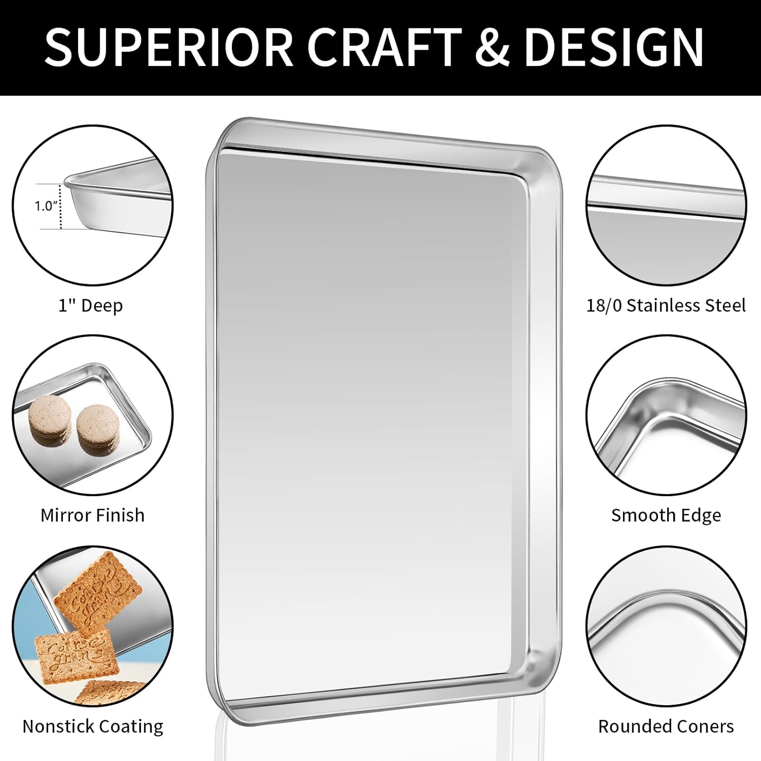 - HEAVY DUTY & SUPERIOR CRAFT: Thick gauge baking pan with rack set with sturdy construction, proper weight & the reinforced rolled edge provides extra strength to help prevent twisting and warping in the oven and durable for a long service life. Highly mirror polished of the surface of stainless steel baking sheet are great to reduce the risk of food sticking and easily release food. Baking rack with tight grid has 6 raised feet, keeping meat lifted above juice and easily release