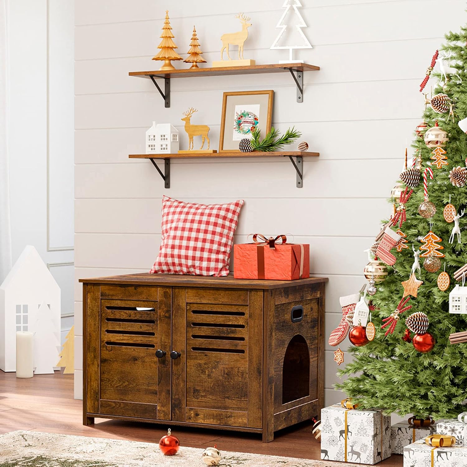 DINZI LVJ Long Wall Shelves, 31.5 Inch Wall Mounted Shelves Set of 2, Easy-to-Install, Wall Storage Ledges with Sturdy Metal Brackets for Living Room, Bathroom, Bedroom, Kitchen, Rustic Brown