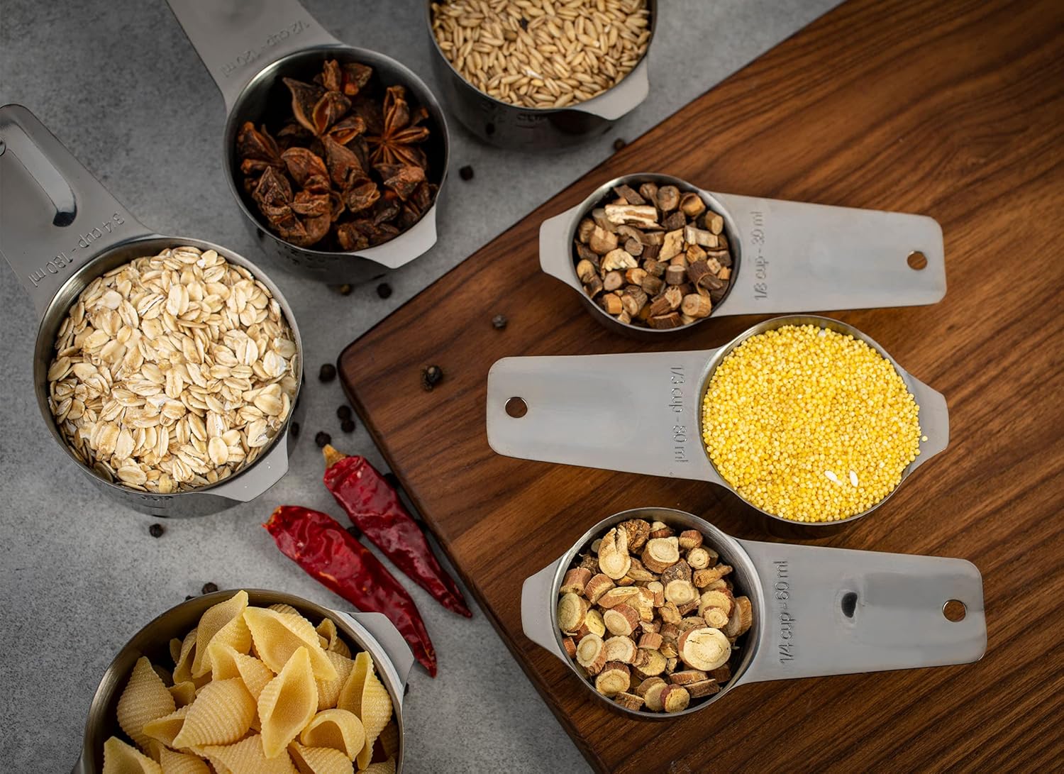 - Contains 7 cups: 1/16cup, 1/4 cup, 1/3 cup, 1/2 cup, 2/3 cup, 3/4 cup, 1 cup.